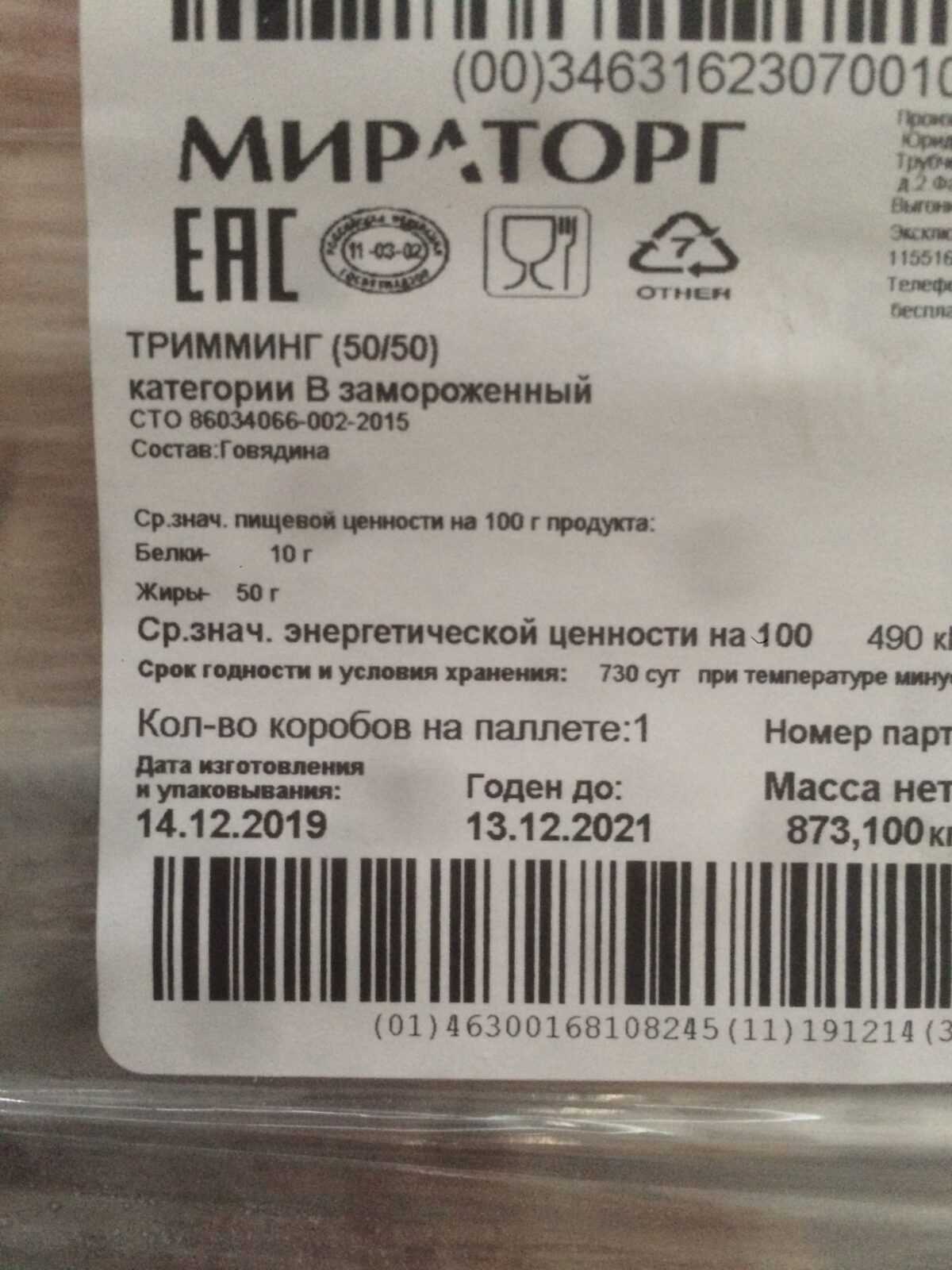 Average nutritional value per 100 g.: Proteins-10 g. fats-50 g. Average energy value per 100 g.: 490kcal/2020 kJ. Expiration date and storage conditions: 730 days at temperature below minus 18°C.