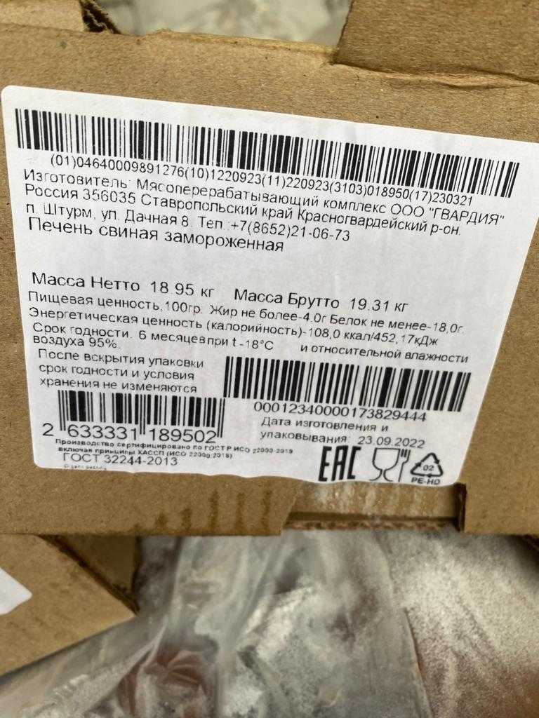 Nutritional and energy value per 100g. product (average value): Proteins-14g. Fat-4g. kcal 108/kJ 451.4. Shelf life and storage conditions: 6 months at a temperature not higher than minus 18°C and relative humidity 85%