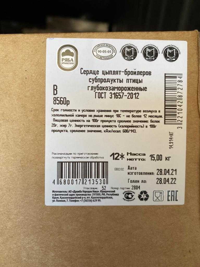 Nutritional value per 100 g. (average values): proteins-15 g. Fats-10 g. Energy value (calorie value) 630 kJ(150 kcal). Expiration date and storage conditions: 12 months at temperatures below minus 18°C.