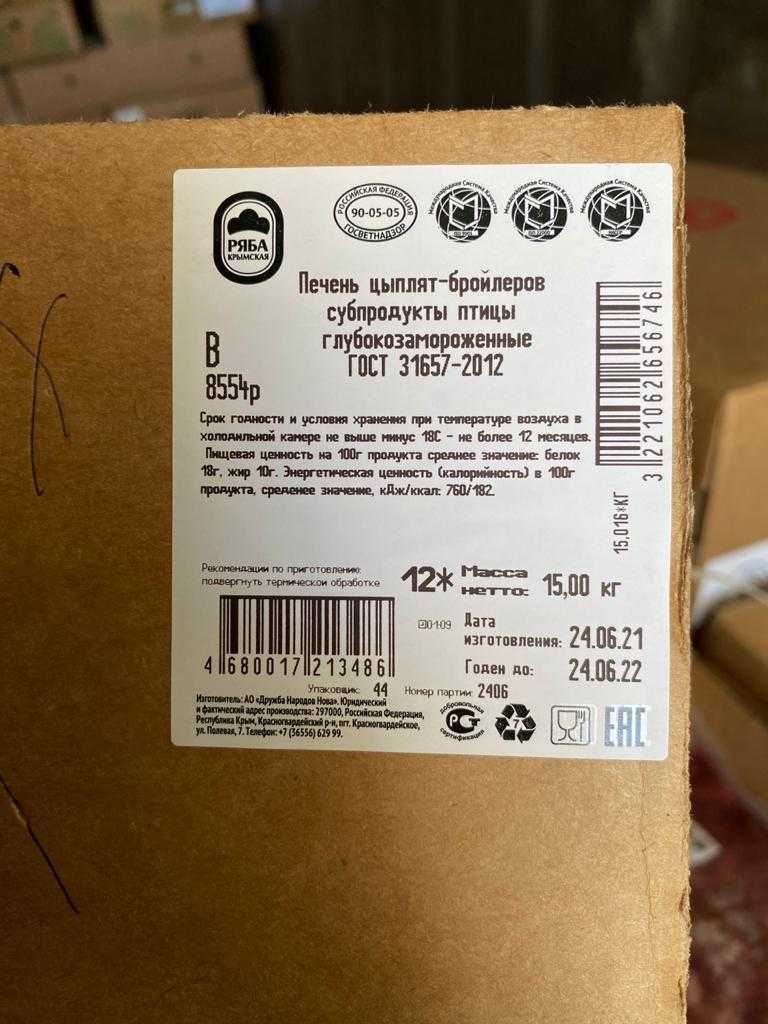Nutritional value per 100 g. Average values: proteins-18 g., Fats-10 g. Energy value (calorie value) per 100 g., average value, kJ/ kcal: 760/182. Expiration date and storage conditions: 12 months at temperatures below minus 18°C.