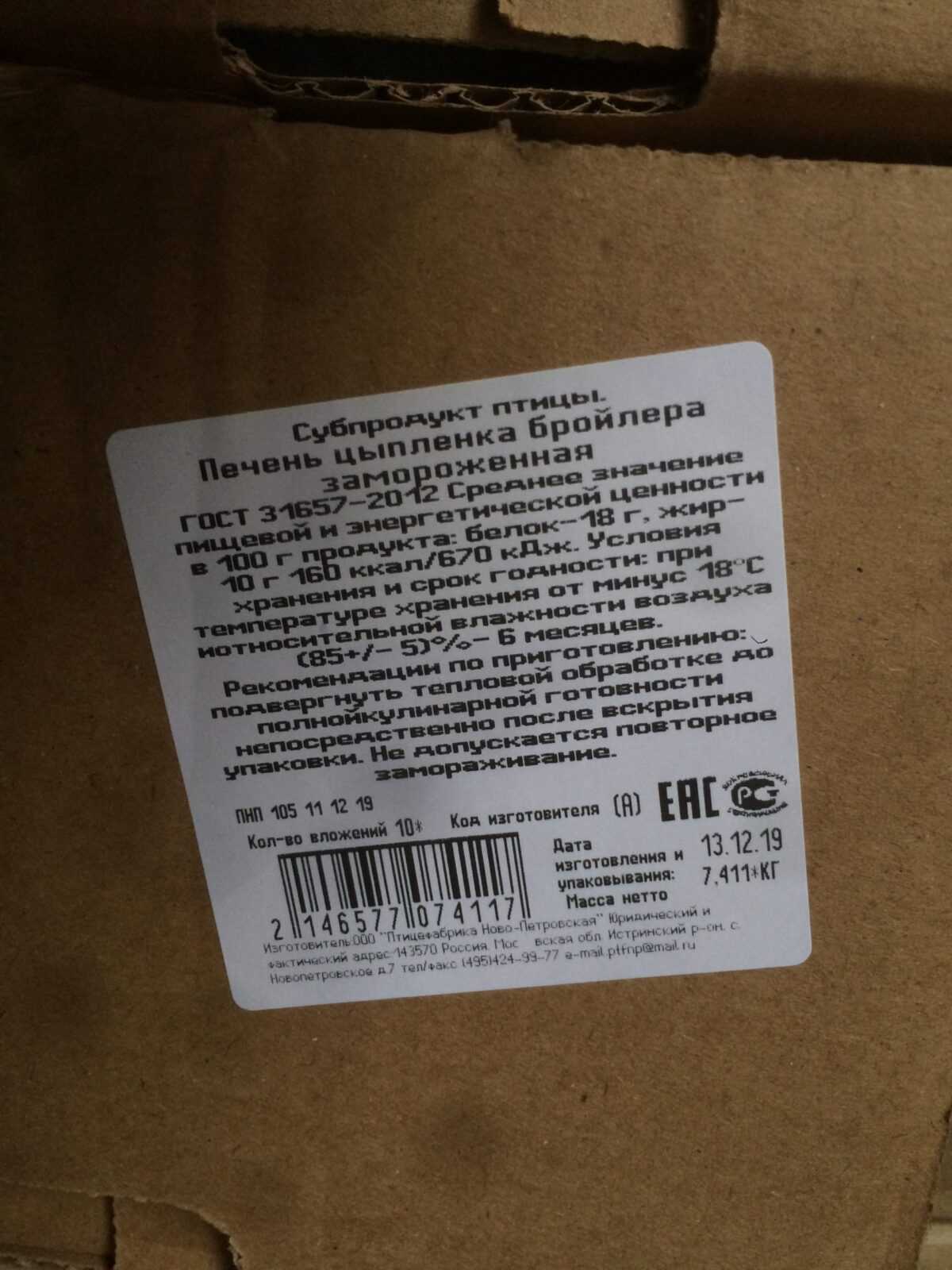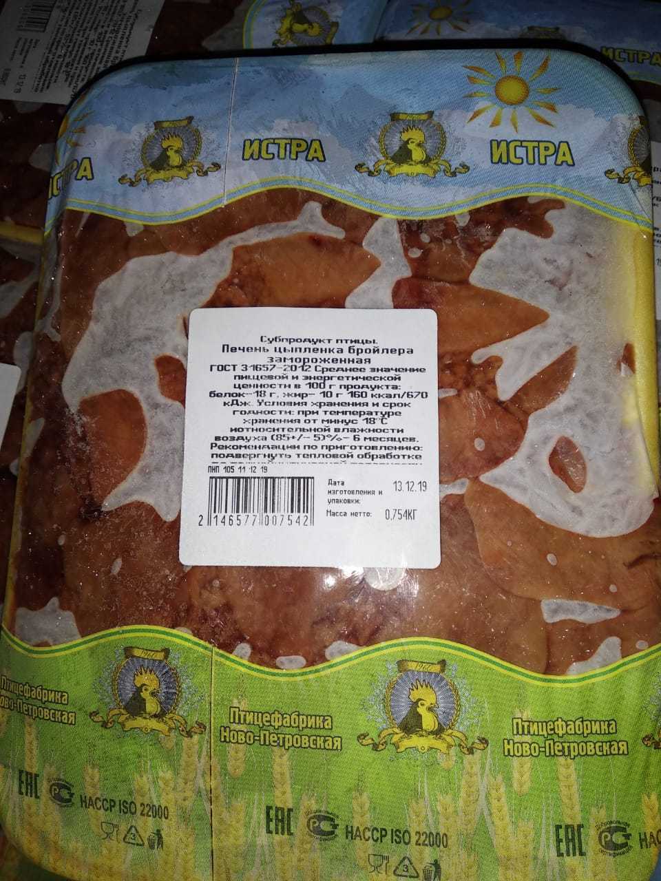 Average nutritional and energy value per 100 g.: proteins-18 g. Fats-10 g. 160 kcal/670 kJ. Expiration date and storage conditions: 6 months at temperatures below minus 18°C and relative humidity 80-90%.