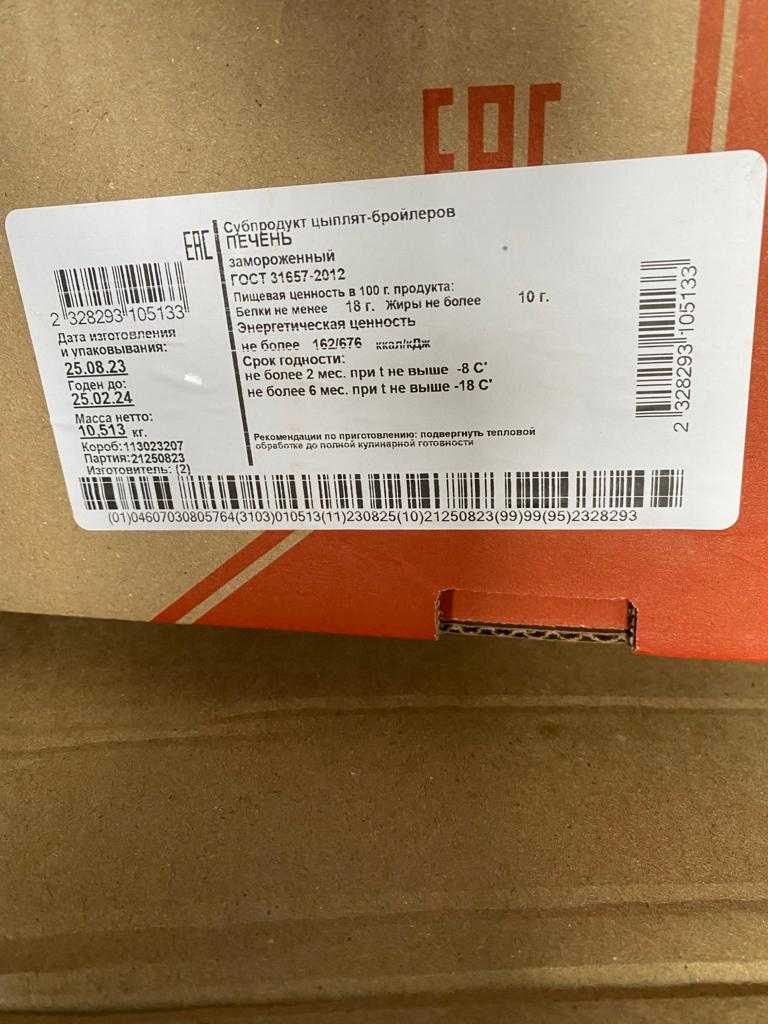 Nutritional value per 100 g. (average values): Proteins-18 g. fats-10 g. Energy value 162/676kcal/ kJ. Expiration date and storage conditions: 6 months at temperatures below minus 18°C, 2 months at temperatures below minus 8°C.