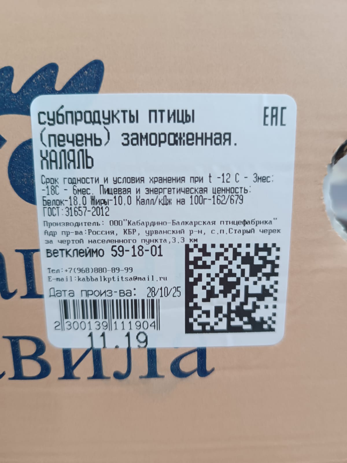 Nutritional and energy value per 100 g. (average values): Proteins-18 g. Fats-10 g.kcal 162/ kJ 679. Expiration date and storage conditions: 6 months at temperatures below minus 18°C, 3 months at temperatures below minus 12°C.