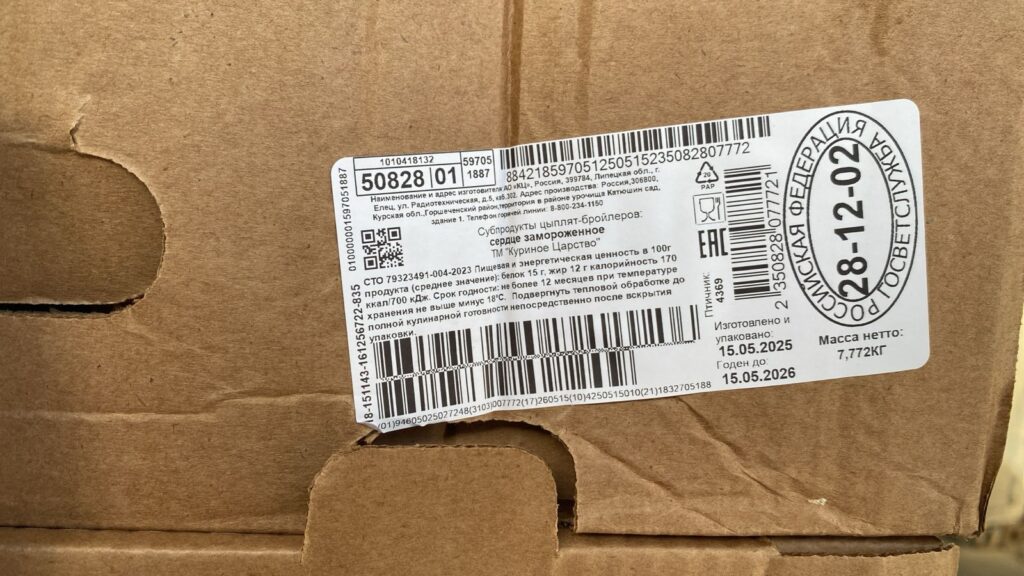 The average value of nutritional and energy value in 100g. product: protein-15g. fat-10g. Calorie-150kcal / 630kJ. Shelf life and storage conditions: 12 months at a temperature not higher than minus 18°C.