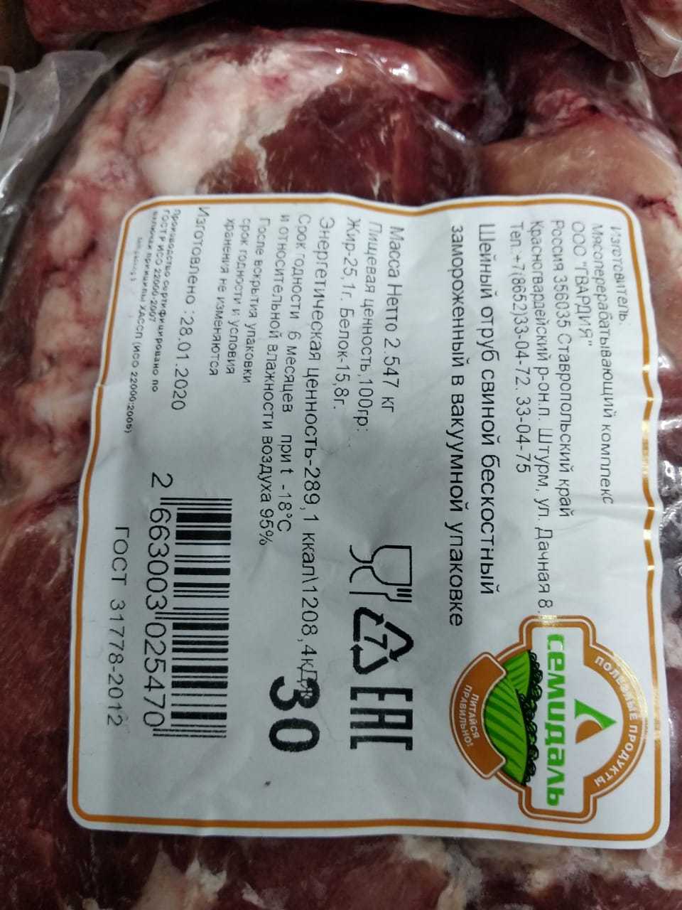 Nutritional value per 100 g. (average values): Proteins-15,8 g. fats-25 g. Energy value: 289,1 kcal/1208,4 kJ. Expiration date and storage conditions: 6 months at temperatures below minus 18°C and relative humidity 95%.