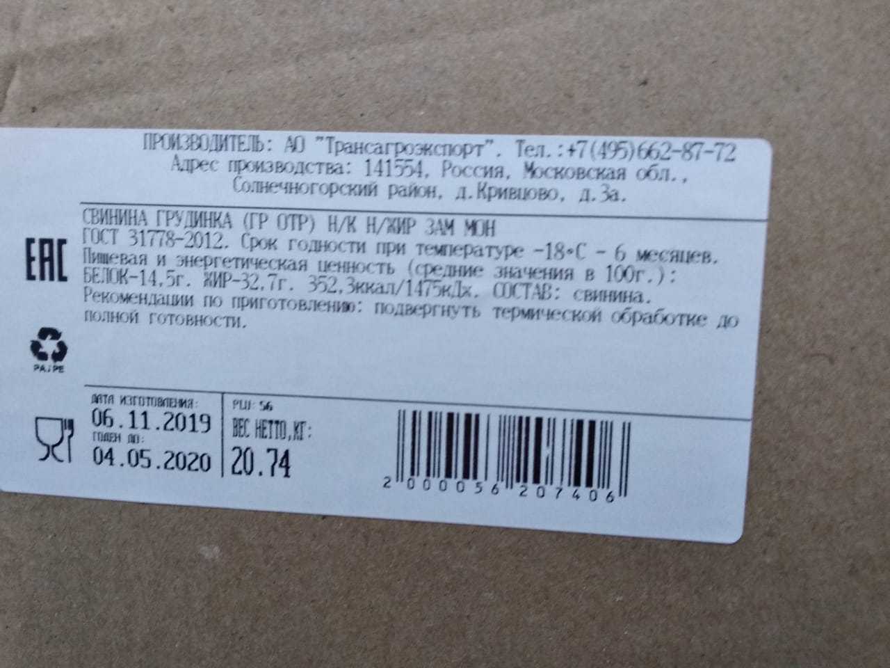 Nutritional and energy value (average value per 100 g.): proteins-14,5 g. Fats-32,7 g. 352,3 kcal/1475 kJ. Expiration date and storage conditions: 6 months at temperatures below minus 18°C.