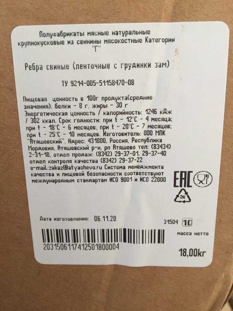 Nutritional and energy value per 100 g. (average values): Proteins-8 g. Fats-30 g.kcal 302/ kJ 1246. Expiration date and storage conditions: 10 months at temperatures below minus 25°C, 7 months at temperatures below minus 20°C, 6 months at temperatures below minus 18°C, 4 months at temperatures below minus 12°C.