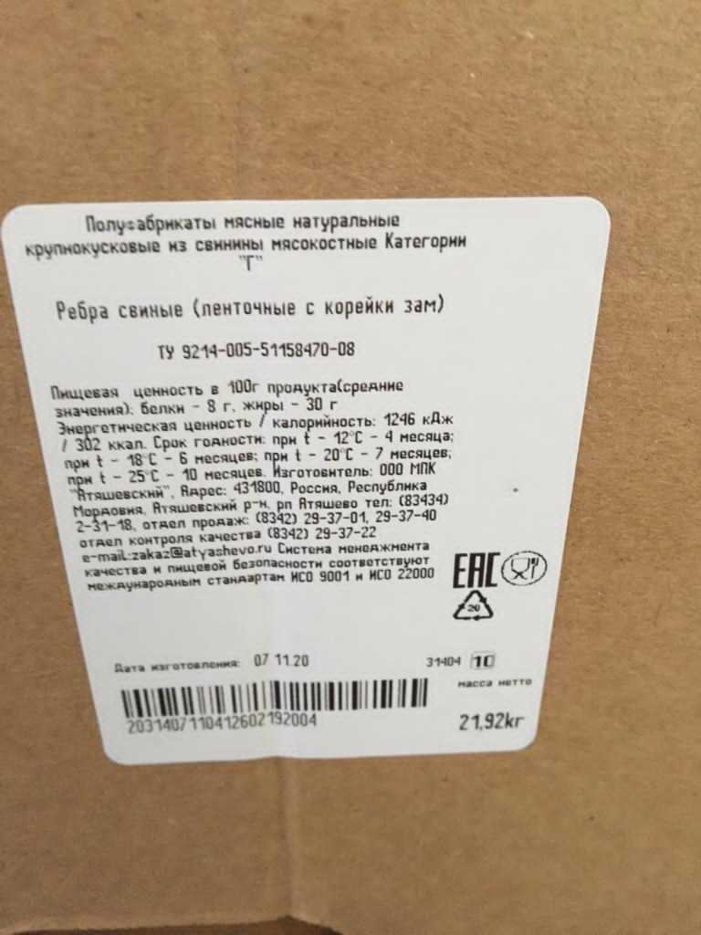 Nutritional and energy value per 100 g. (average values): Proteins-8 g. Fats-30 g.kcal 302/ kJ 1246. Expiration date and storage conditions: 10 months at temperatures below minus 25°C, 7 months at temperatures below minus 20°C, 6 months at temperatures below minus 18°C, 4 months at temperatures below minus 12°C.