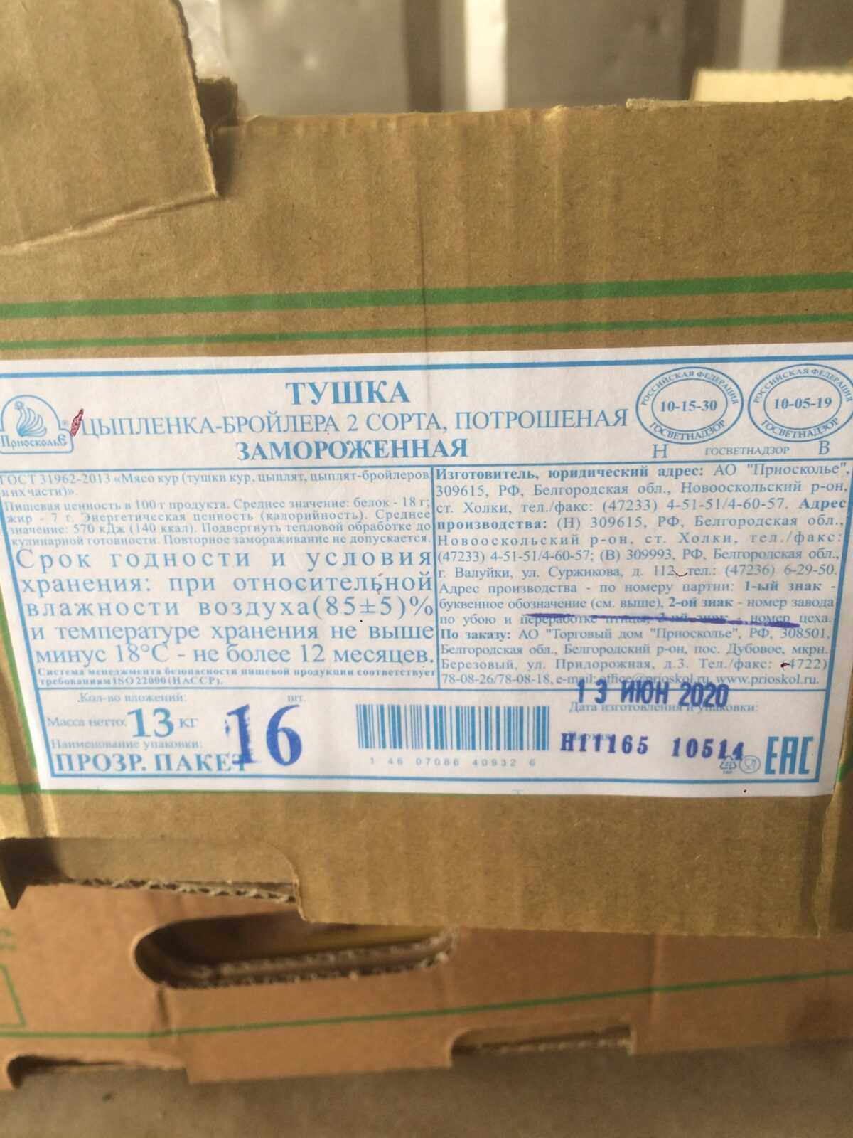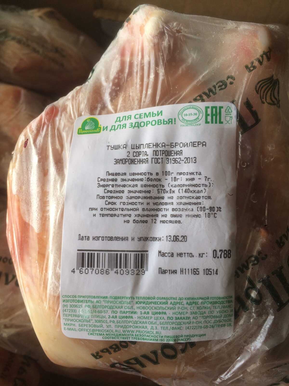 Nutritional value per 100 g. Average values: proteins-18 g.; Fats-7 g. Energy value (calorie value), average value: 570 kJ (140kcal). Expiration date and storage conditions: 12 months at temperatures below minus 18°C and relative humidity 80-90%.