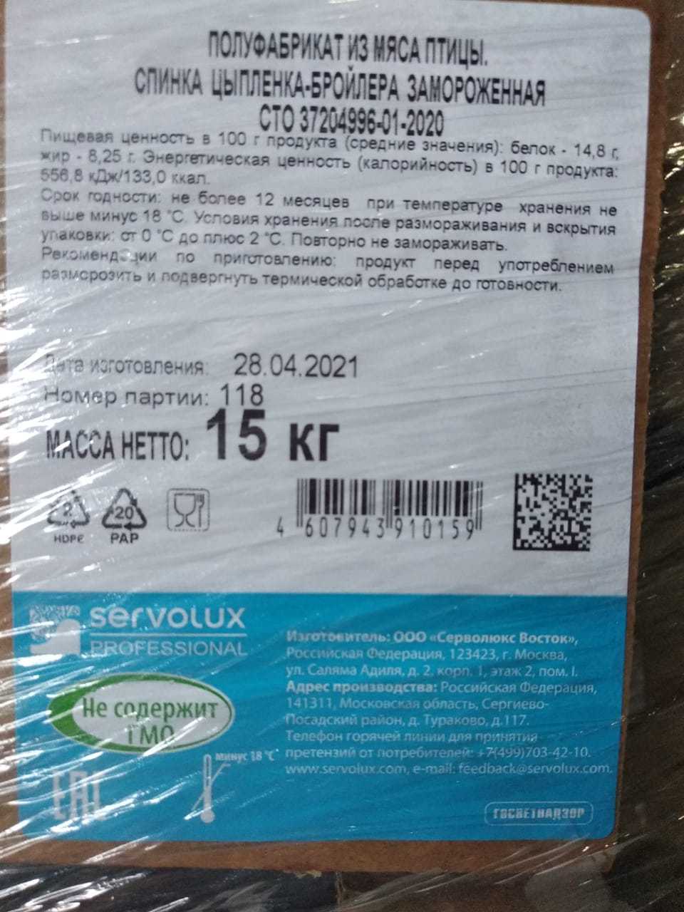 Nutritional value per 100 g. (average values): proteins-14,8 g. Fats-8,25 g. Energy value (calorie value) per 100 g.: 556,8 kJ/133,0 kcal. Expiration date and storage conditions: 12 months at temperatures below minus 18°C.