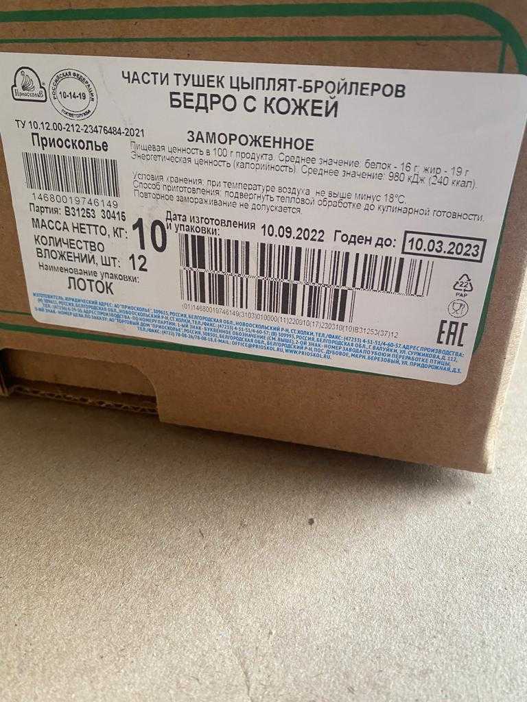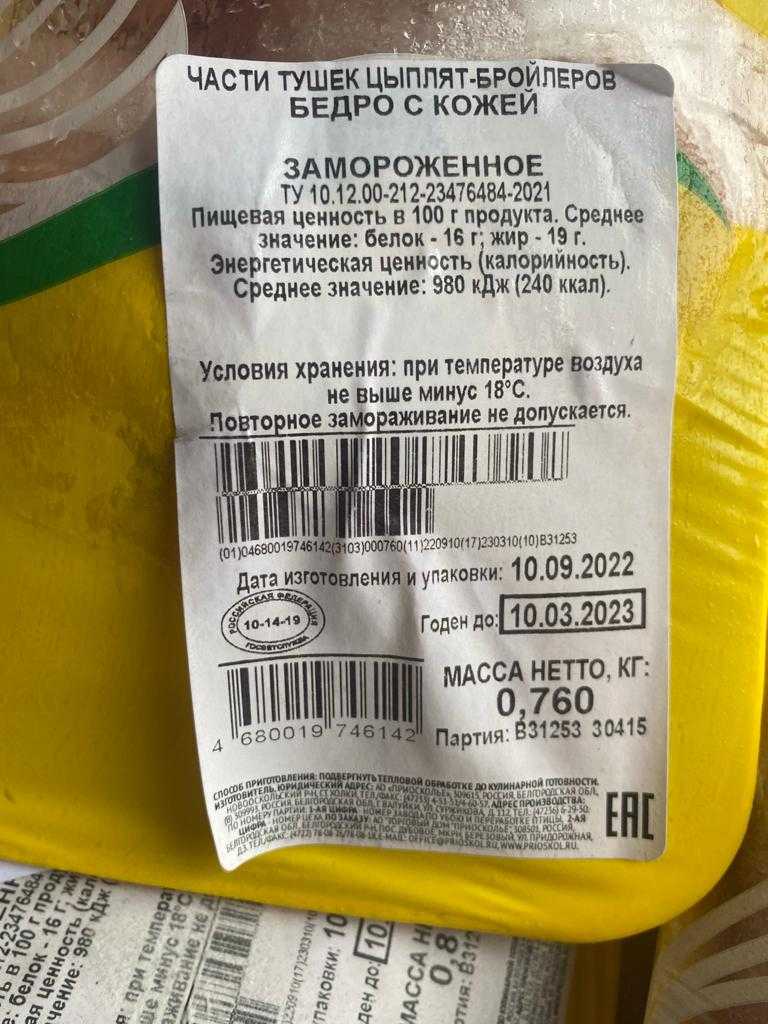 Nutritional value per 100 g of product. Average values: protein-17 g; fat-16 g. Energy value (calorie content). Average value: 880 kJ (210 kcal). Shelf life and storage conditions: 6 months at a temperature not higher than minus 18°C and relative humidity of 80-90%.