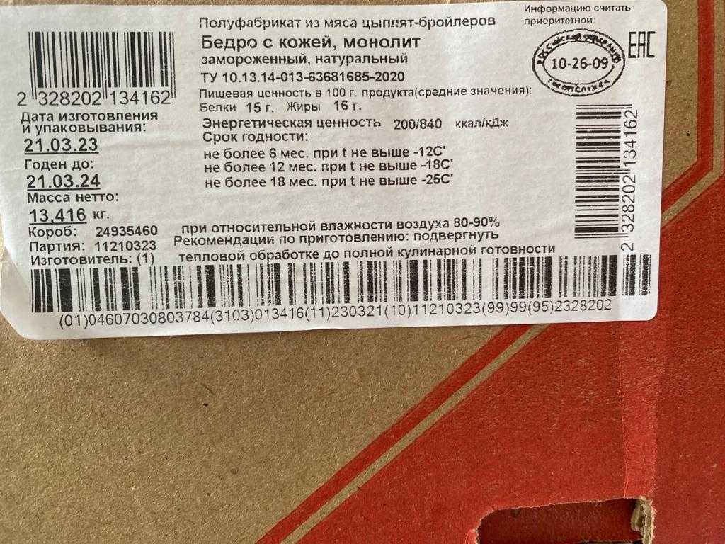 Пищевая и энергетическая ценность на 100г. продукта (среднее значение): Белки-14г. Жир-15г. кКал 191/кДж 800. Cрок годности и условия хранения: 18 месяцев при температуре не выше минус 25°C, 12 месяцев при температуре не выше минус 18°C, 6 месяцев при температуре не выше минус 12°C и относительной влажности воздуха 80-90%.