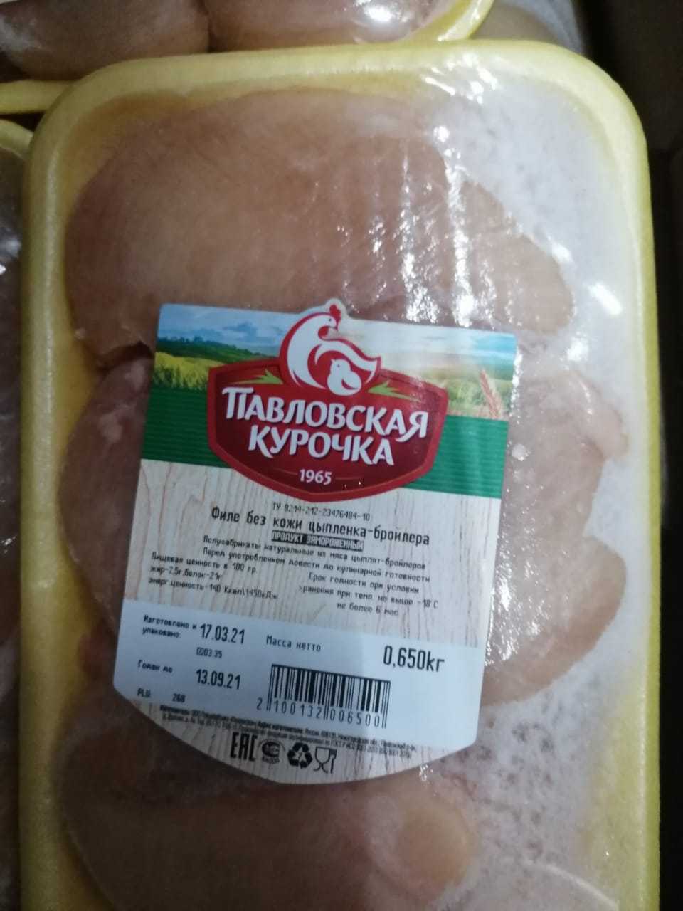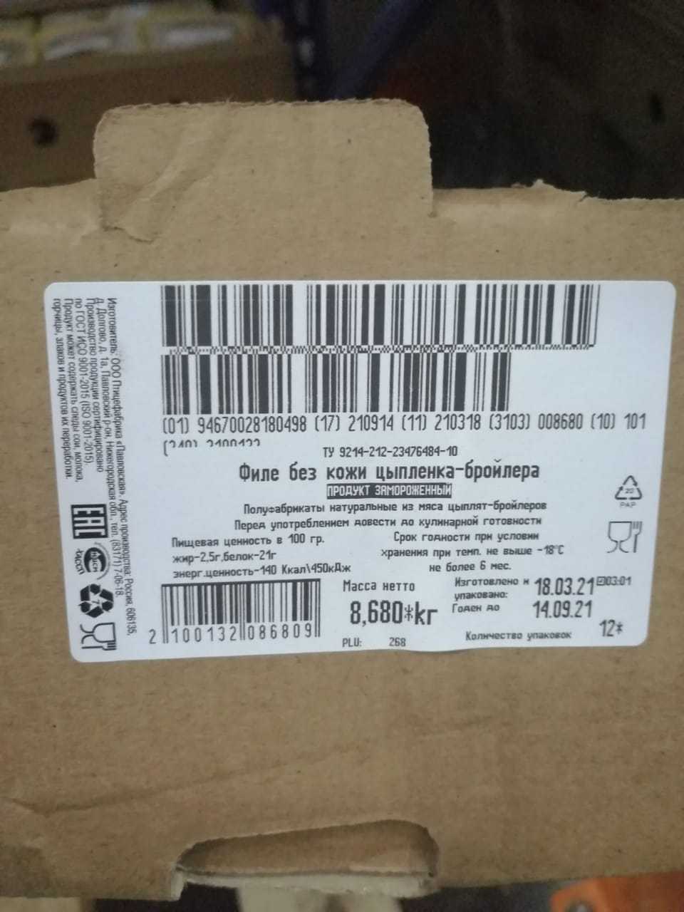 Nutritional and energy value per 100 g. (average values): Proteins-21 g. Fats-2,5 g.kcal 140/ kJ 450. Expiration date and storage conditions: 6 months at temperatures below minus 18°C.