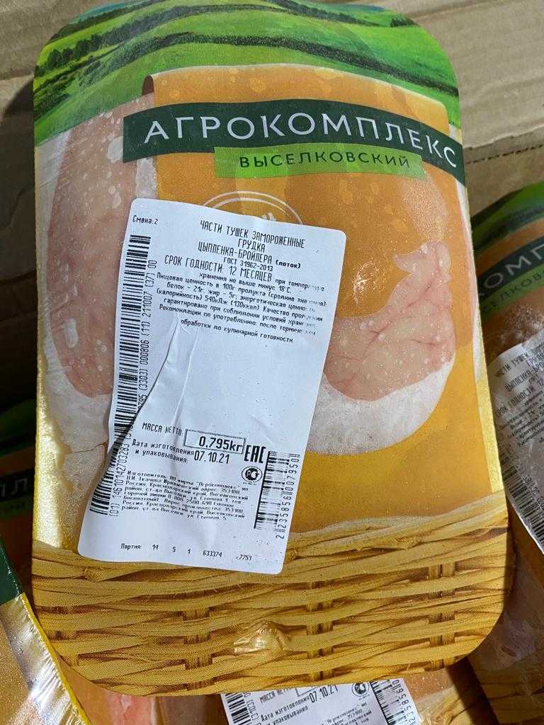 Nutritional value per 100 g. (average values): proteins-21 g., Fats-5 g.; Energy value (calorie value) 540 kJ (130 kcal). Expiration date and storage conditions: 12 months at temperatures below minus 18°C.
