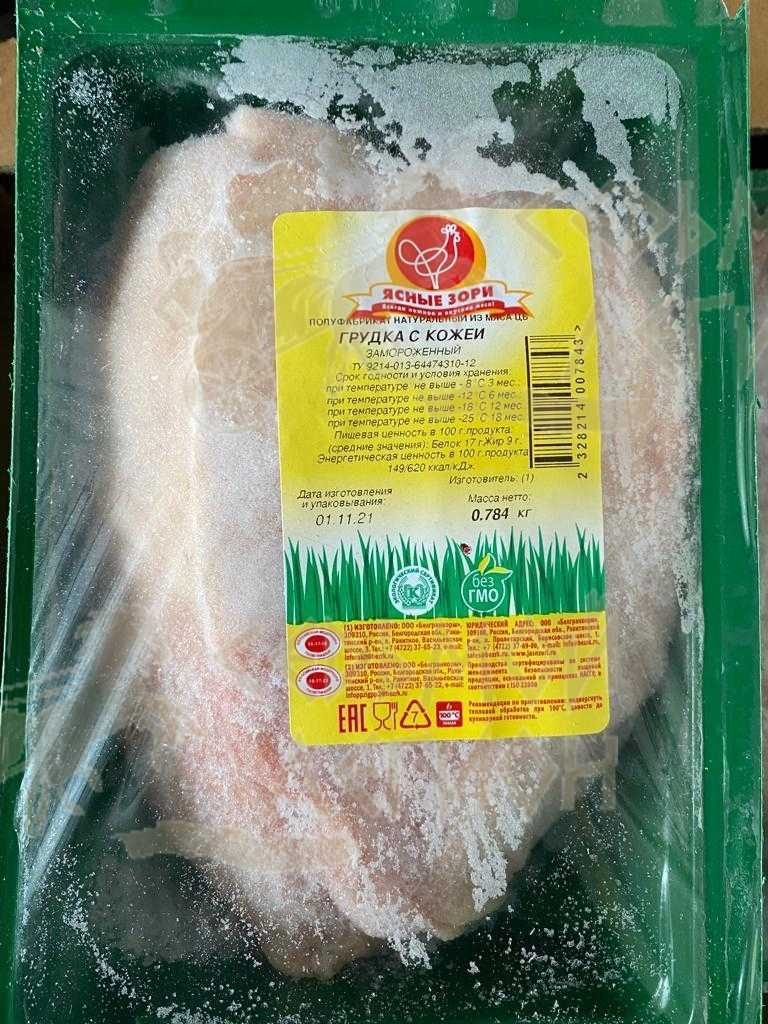 Nutritional value per 100 g.: (average values) proteins-17 g. Fats-9 g. Energy value per 100 g.: 149/620 kcal/ kJ. Expiration date and storage conditions: 18 months at temperatures below minus 25°C, 12 months at temperatures below minus 18°C, 6 months at temperatures below minus 12°C, 3 months at temperatures below minus 8°C.