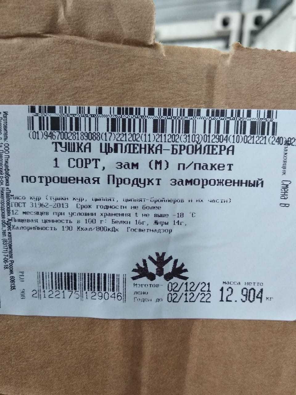 Nutritional and energy value per 100 g. (average values): Proteins-16 g. Fats-14 g.kcal 190/ kJ 800. Expiration date and storage conditions: 12 months at temperatures below minus 18°C.