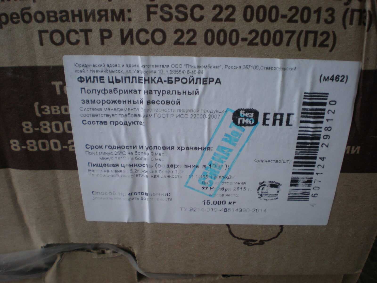 Nutritional value per 100 g.: proteins-3,2 g. Fats-1,8 g. calorie value/Energy value -111,1/465,1 kcal/ kJ. Expiration date and storage conditions: 9 months at temperatures below minus 25°C, 6 months at temperatures below minus 18°C.