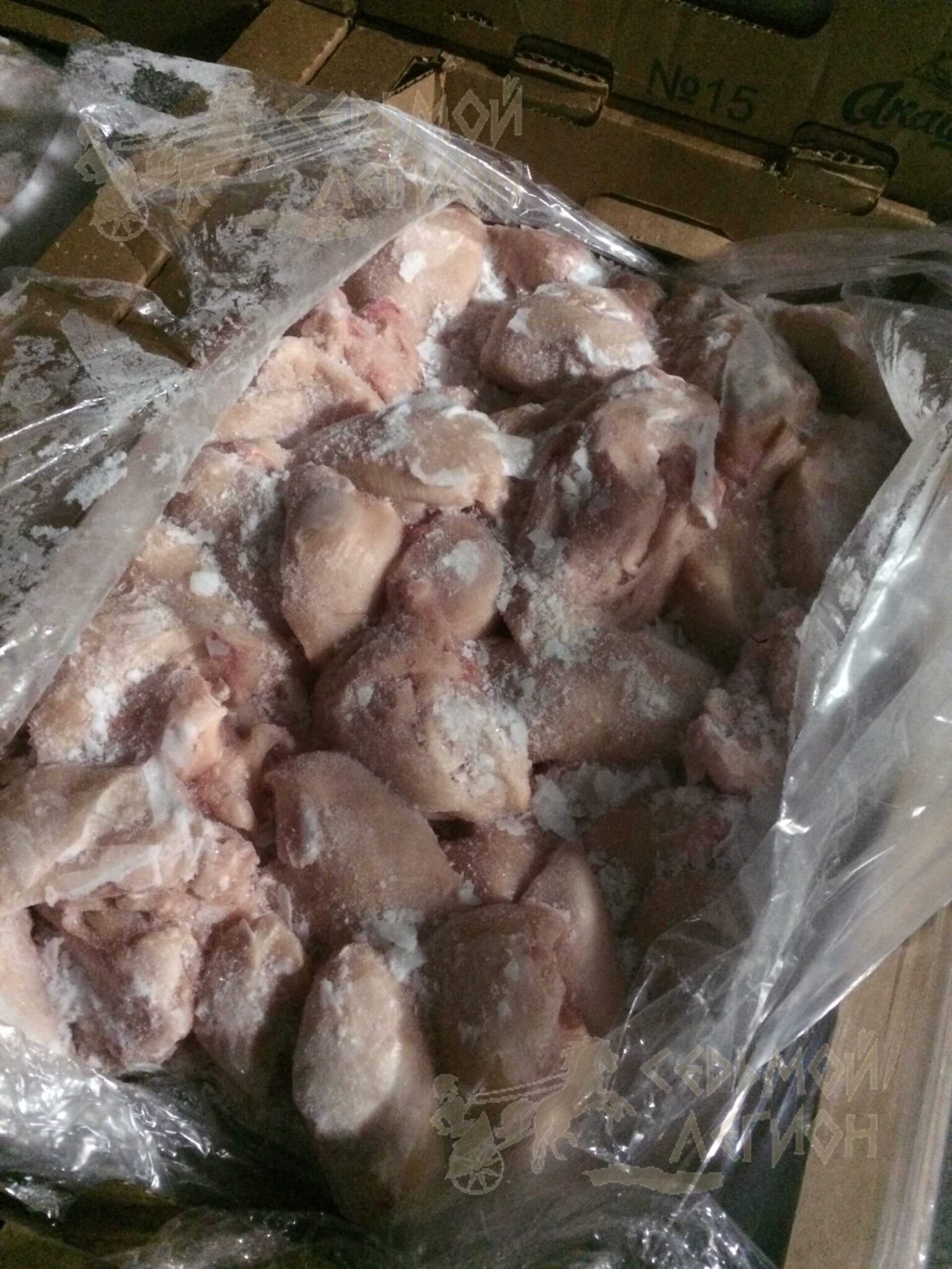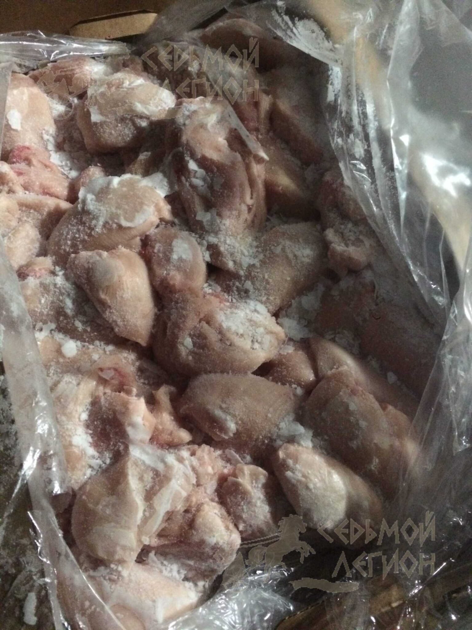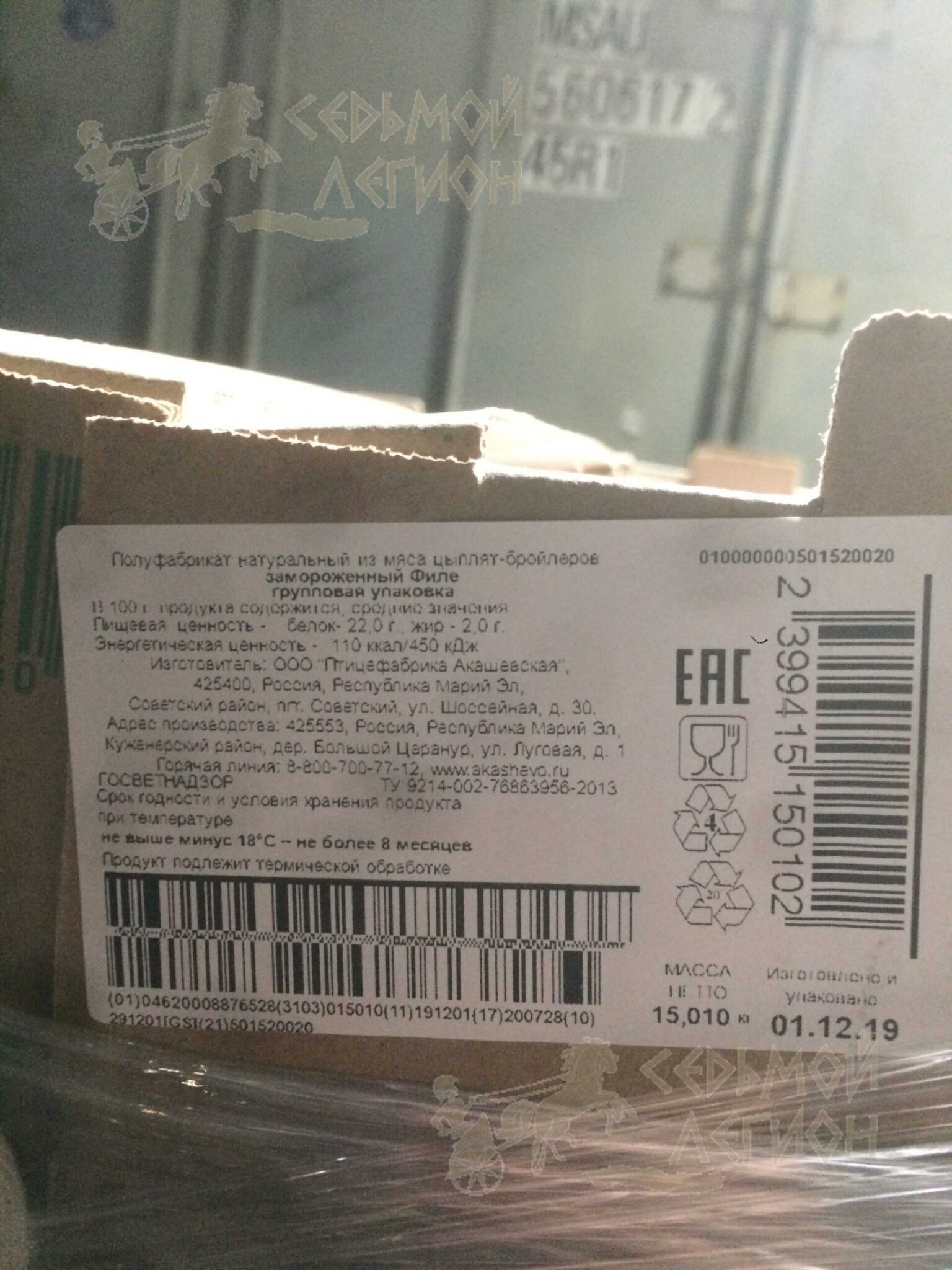 Nutritional value per 100 g.: proteins-22 g. Fats-2 g. Energy value -110 kcal/450 kJ. Expiration date and storage conditions: 8 months at temperatures below minus 18°C.