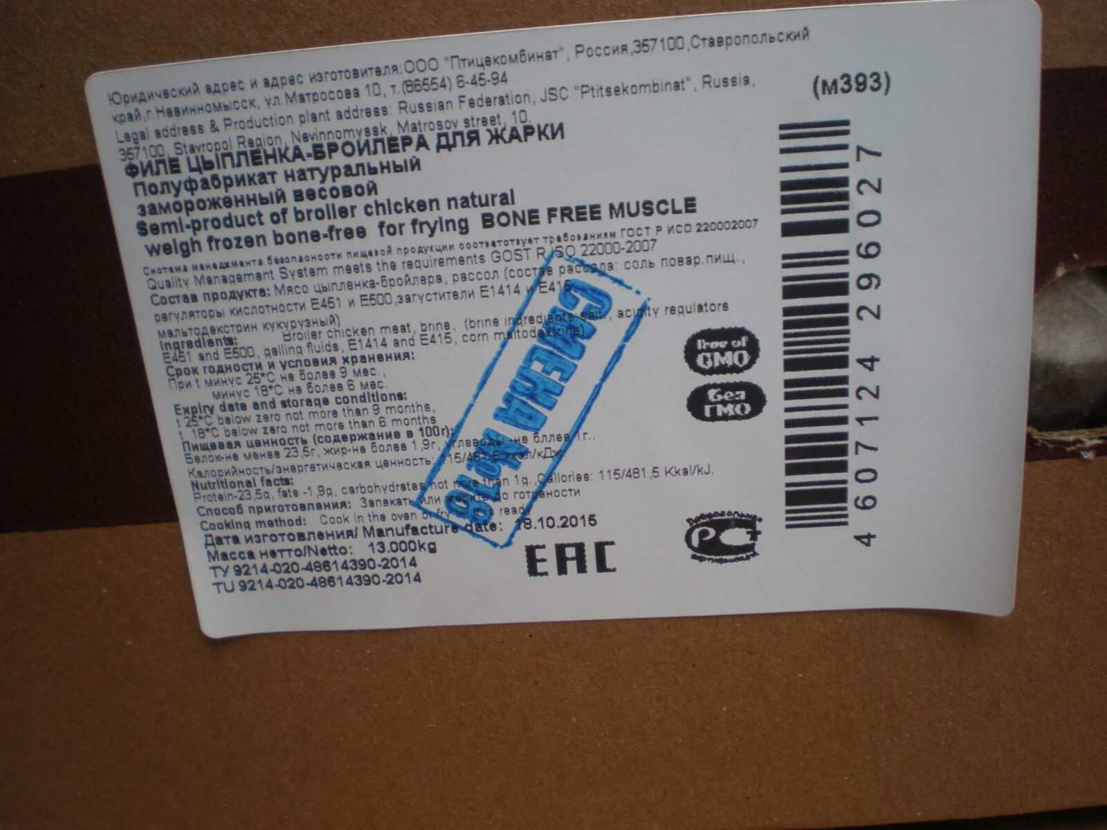 Nutritional and energy value per 100 g. (average values): Proteins-23,5 g. Fats-1,9 g. Carbohydrates-1 g.kcal 115/ kJ 481,5. Expiration date and storage conditions: 9 months at temperatures below minus 25°C, 6 months at temperatures below minus 18°C.
