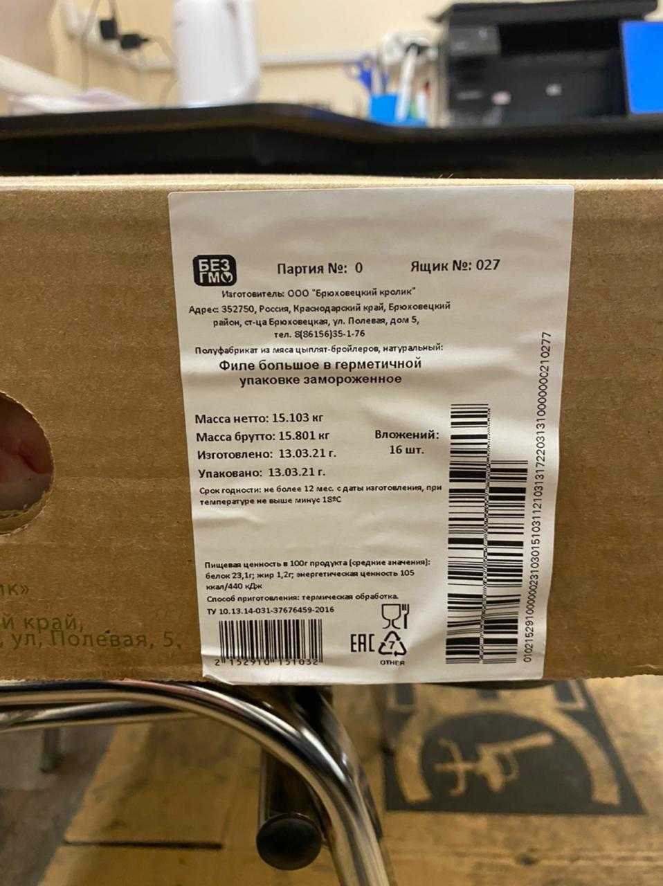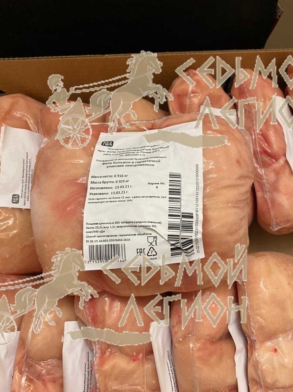 Nutritional value per 100 g. (average values): proteins-23,1 g. Fats-1,2 g.; Energy value 105 kcal/440 kJ. Expiration date and storage conditions: 12 months at temperatures below minus 18°C.