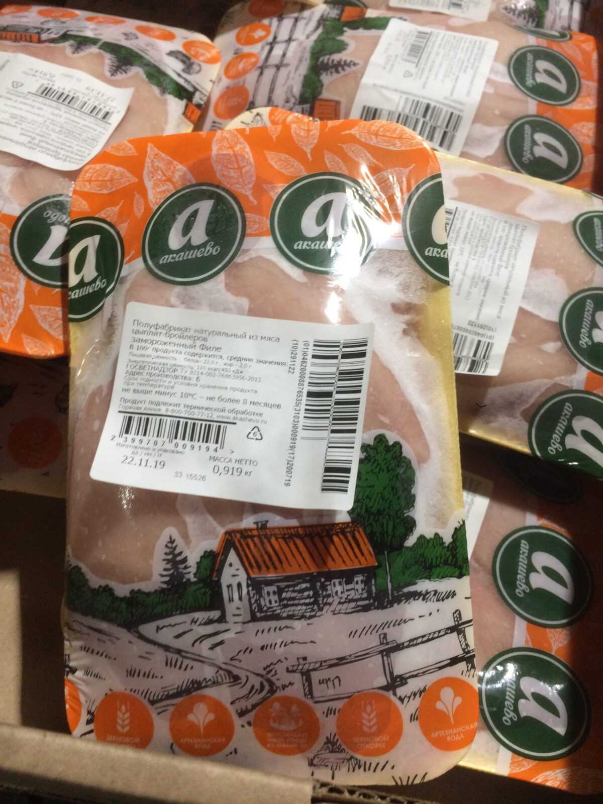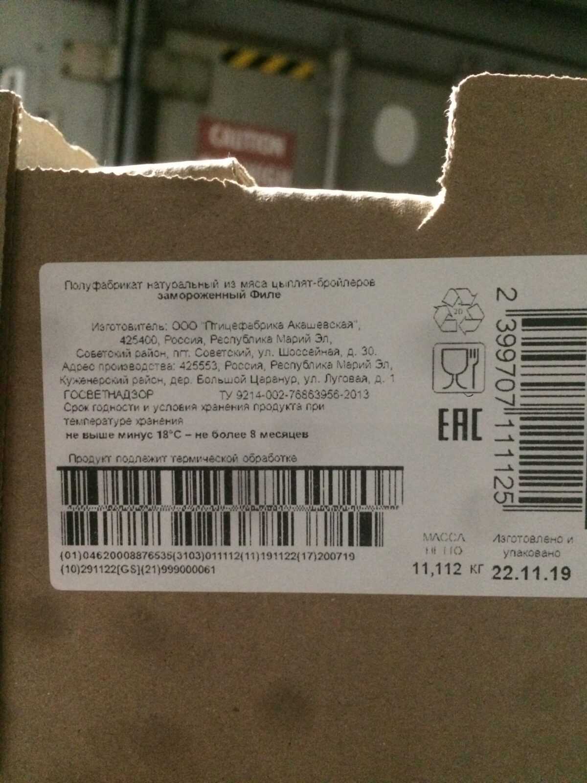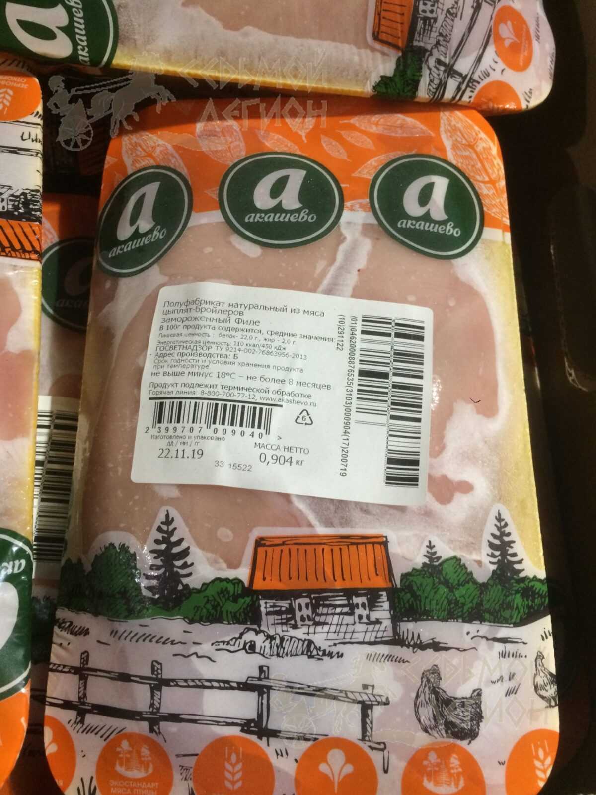 Nutritional value per 100 g: proteins-22,0 g. Fats-2,0 g. Energy value -110 kcal/450 kJ. Expiration date and storage conditions: 8 months at temperatures below minus 18°C.