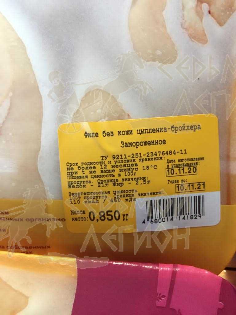 Nutritional value per 100 g. (average values):. proteins-21 g. Fats-2,5 g. Energy value per 100 g. average values: 110 kcal/450 kJ. Expiration date and storage conditions: 12 months at temperatures below minus 18°C.