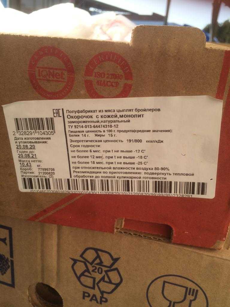 Nutritional value per 100 g. (average values): Proteins-14 g. fats-15 g. Energy value 191/800kcal/ kJ. Expiration date and storage conditions: 18 months at temperatures below minus 25°C, 12 months at temperatures below minus 18°C, 6 months at temperatures below minus 12°C and relative humidity 80-90%.