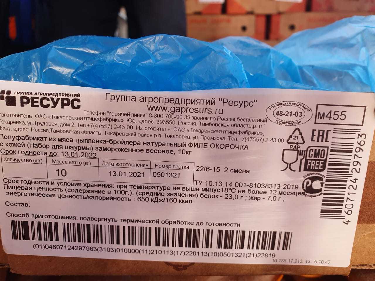 Nutritional value (per 100 g.): (average values) proteins-23,0 g.; Fats-7,0 g.; Energy value /calorie value: 650 kJ/160kcal. Expiration date and storage conditions: 12 months at temperatures below minus 18°C.