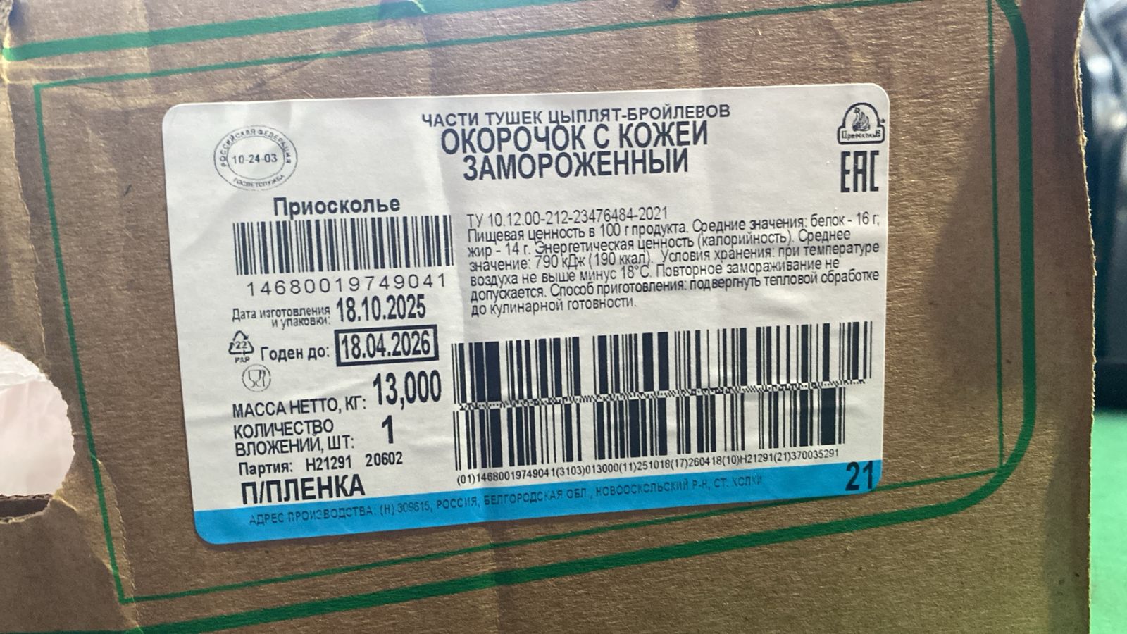 ПОЛУЧИТЬ СПЕЦИАЛЬНОЕ ПРЕДЛОЖЕНИЕ (ПРАЙС-ЛИСТ)GET A SPECIAL OFFER (PRICE LIST)Nutritional and energy value per 100 g. (average values): Proteins-18 g. Fats-15 g.kcal 210/ kJ 860. Expiration date and storage conditions: 6 months at temperatures below minus 18°C and relative humidity 80-90%.