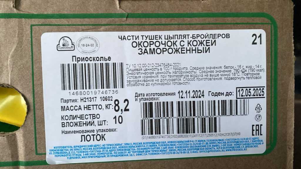 Nutritional value per 100 g., average value: proteins-18 g.; Fats-15 g. Energy value (calorie value). average value 860 kJ (260kcal). Expiration date and storage conditions: 6 months at temperatures below minus 18°C.