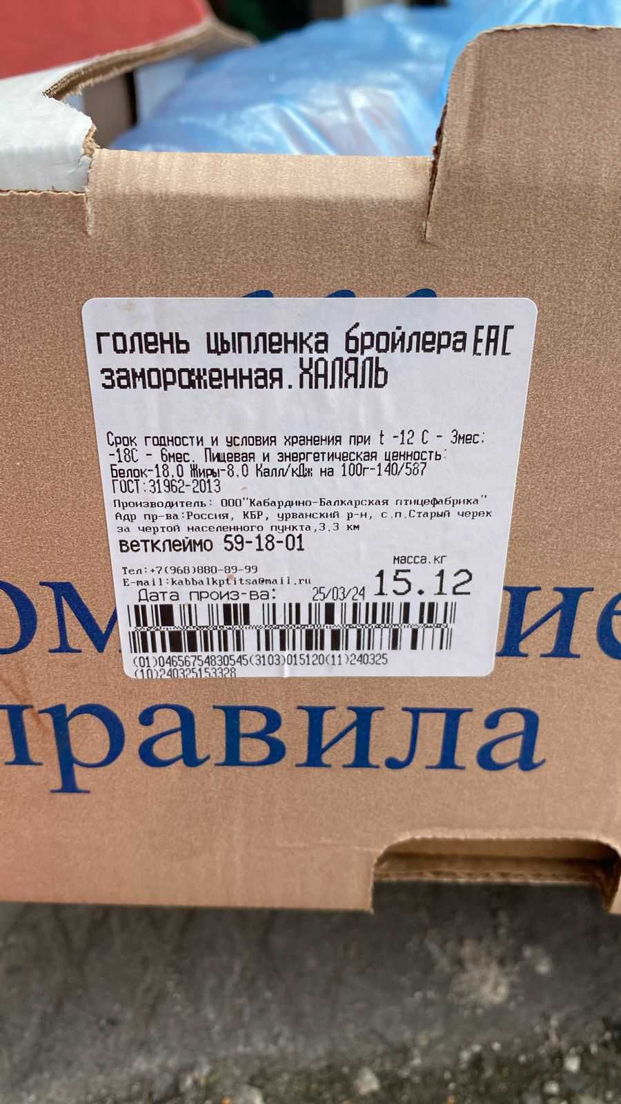 Nutritional and energy value per 100 g. (average values): Proteins-18 g. Fats-8 g.kcal 140/ kJ 587. Expiration date and storage conditions: 5 days at temperatures from 0 to 4°C and relative humidity 60-85%.
