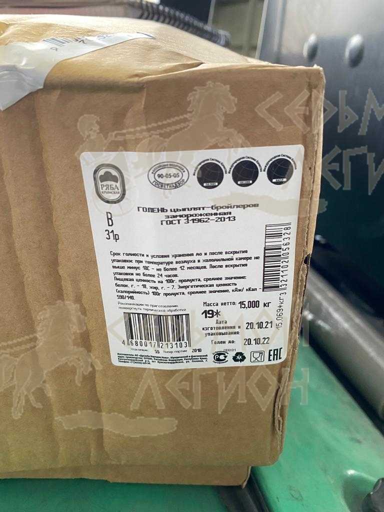 Nutritional value per 100 g. Average values: proteins-12 g., Fats-30 g., Carbohydrates-13 g. Energy value (calorie value). average value: 1540 kJ (370kcal). Expiration date and storage conditions: 12 months at temperatures below minus 18°C.