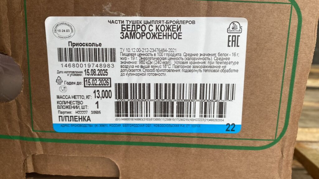 Nutritional and energy value per 100 g. (average values): Proteins-16 g. Fats-19 g.kcal 240/ kJ 980. Expiration date and storage conditions: 6 months at temperatures below minus 18°C.