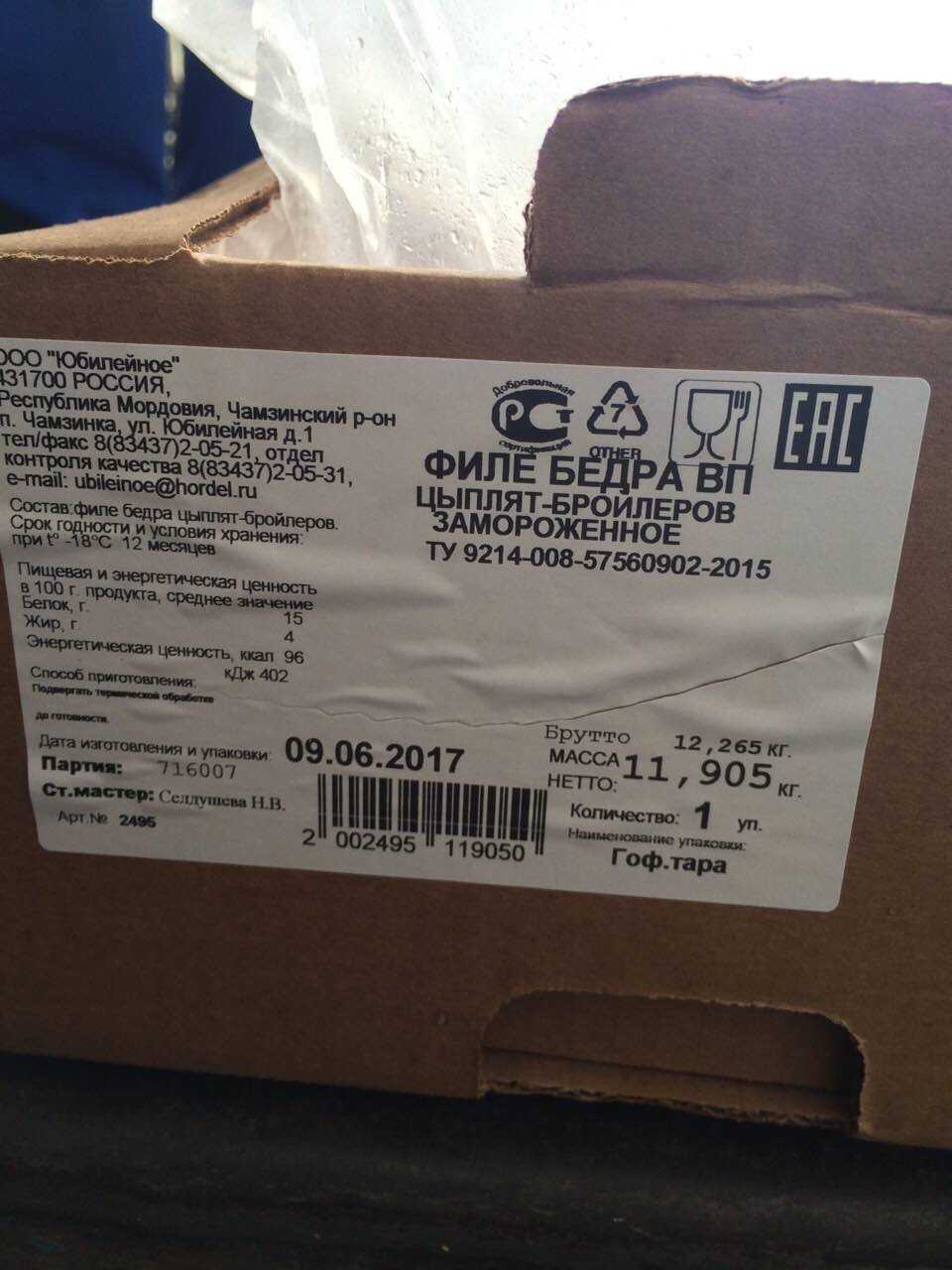 Nutritinal and energy value per 100 g., average value: proteins-15 g. Fats-4 g. Energy value ,kcal 96/ kJ 402. Expiration date and storage conditions: 12 months at temperatures below minus 18°C.