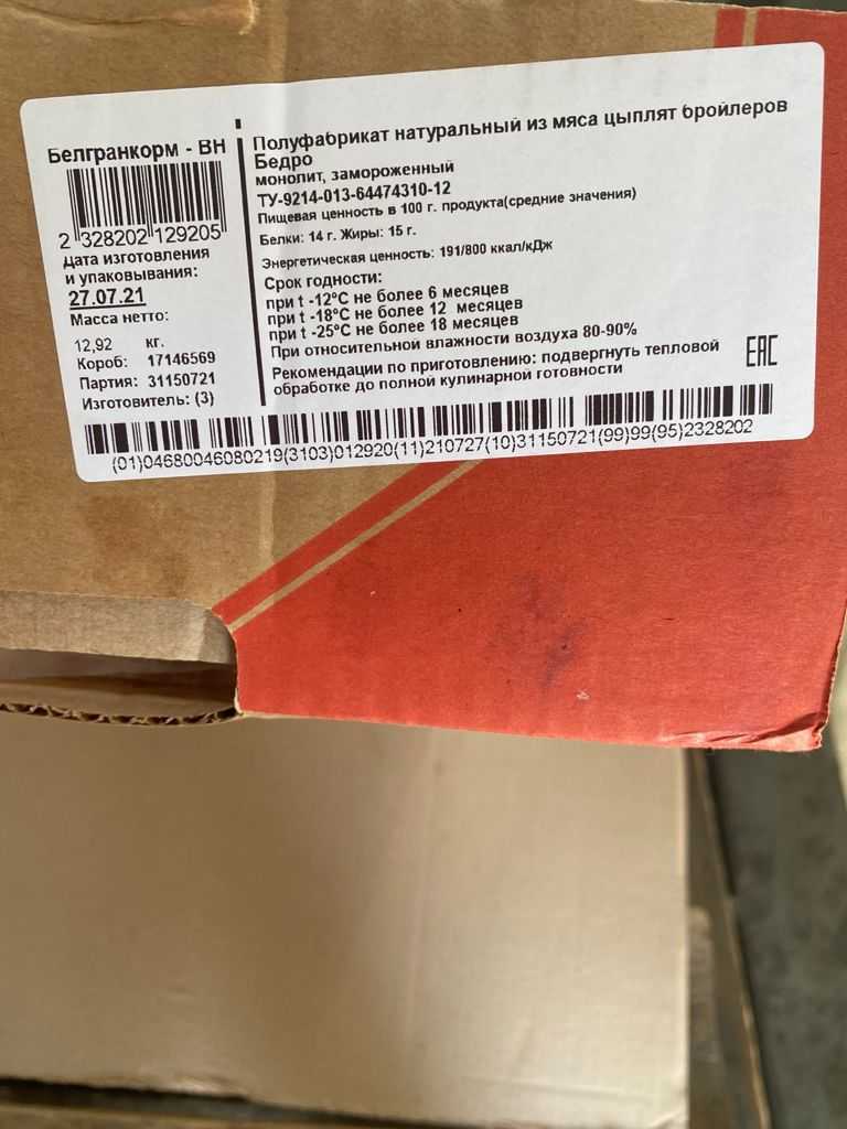 Nutritional and energy value per 100 g. (average values): Proteins-14 g. Fats-15 g.kcal 191/ kJ 800. Expiration date and storage conditions: 18 months at temperatures below minus 25°C, 12 months at temperatures below minus 18°C, 6 months at temperatures below minus 12°C and relative humidity 80-90%.