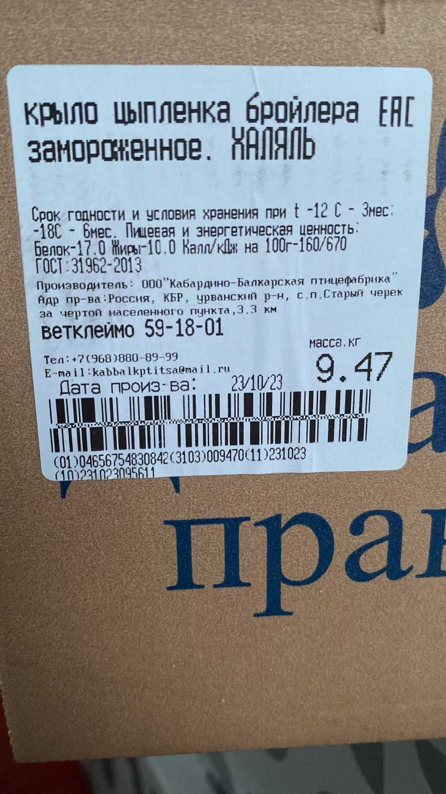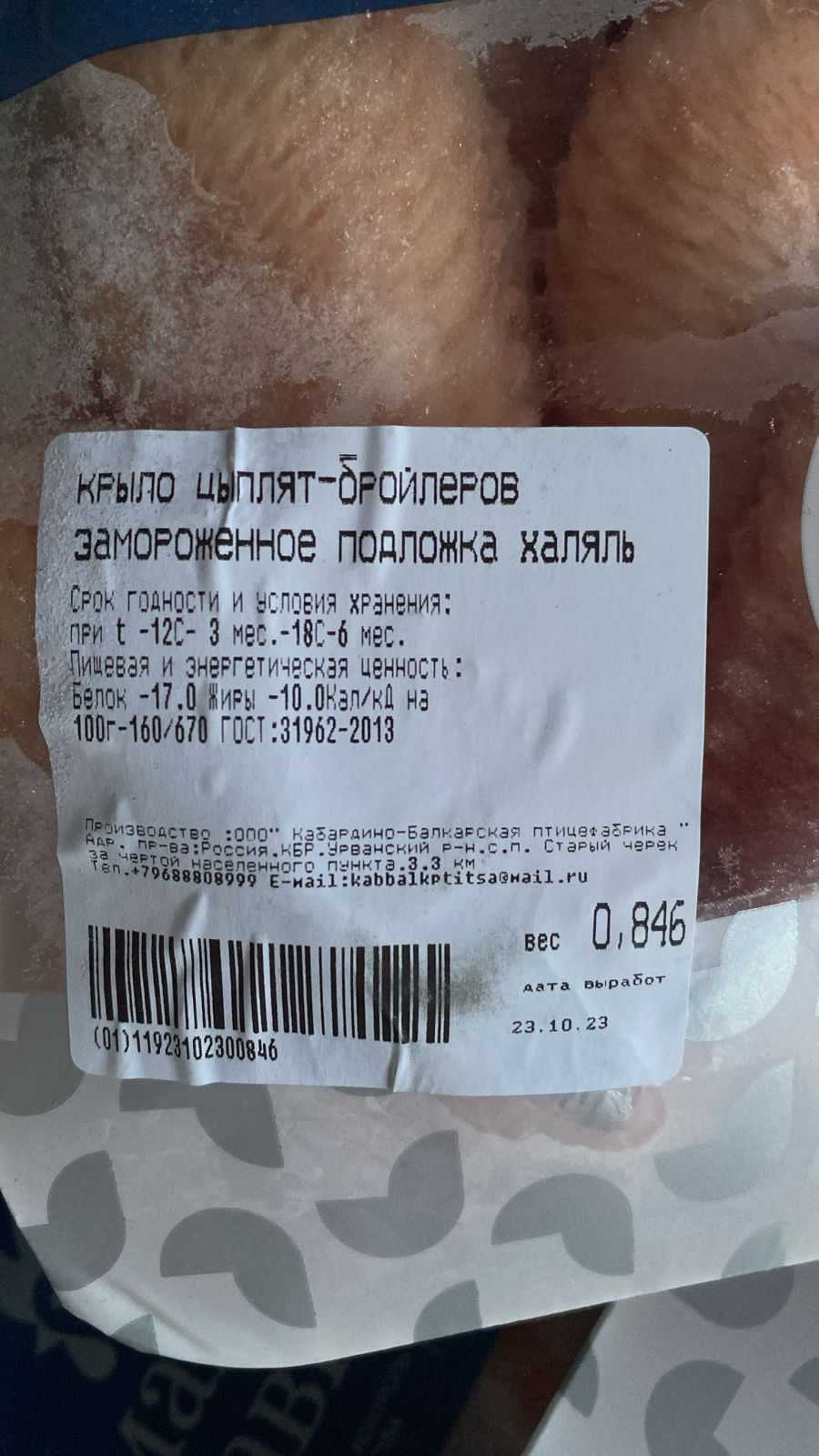 Nutritional and energy value per 100 g. (average values): Proteins-17 g. Fats-10 g.kcal 160/ kJ 670. Expiration date and storage conditions: 6 months at temperatures below minus 18°C, 3 months at temperatures below minus 12°C.