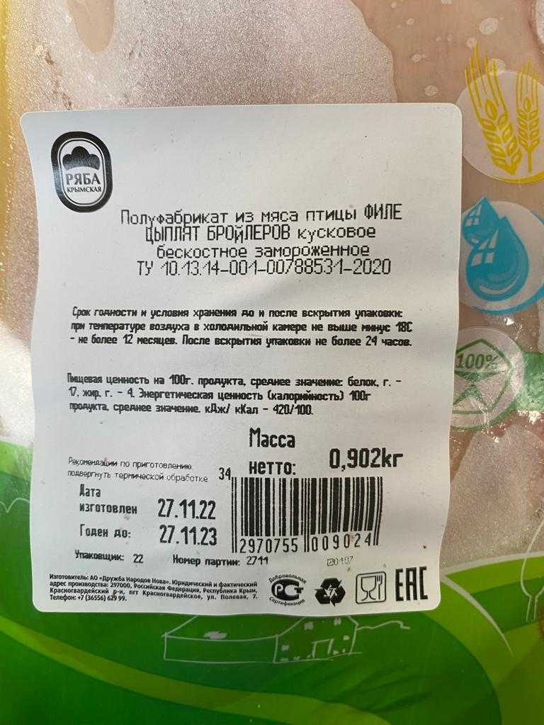 Nutritional value per 100g. product. average value: protein-17g, fat-4g. Energy value (calorie content) of 100g of the product. average value, kJ-420/100. Shelf life and storage conditions: 12 months at a temperature not higher than minus 18°C.