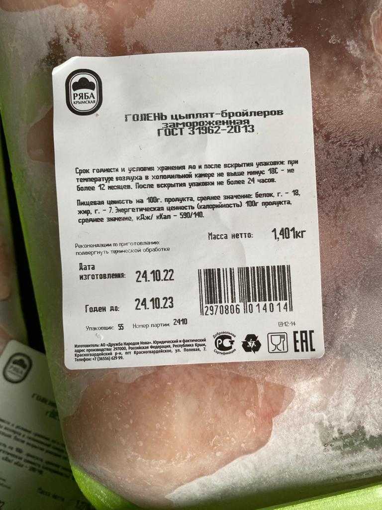 Nutritional value per 100g of product. The average value of protein-12g, fat-30g, carbohydrates-13g. Energy value (calorie content). Average value: 1540 kJ (370 kcal). Shelf life and storage conditions: 12 months at a temperature not higher than minus 18°C.