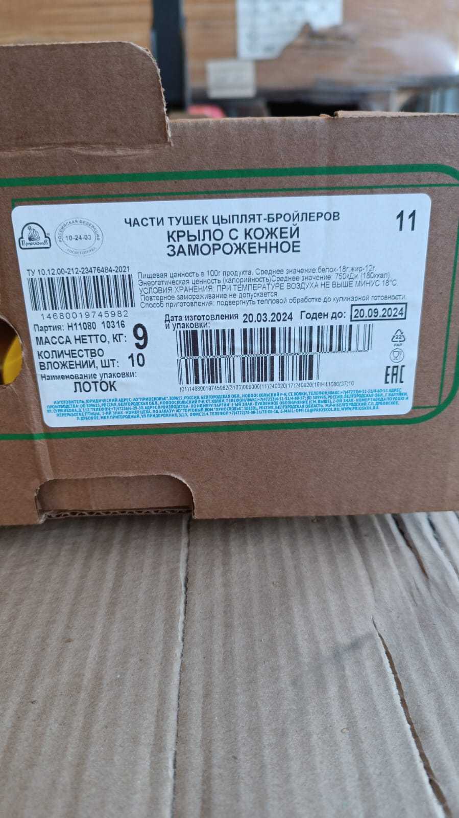 Nutritional value per 100 g of product. Average value: protein-18 g; fat-10 g. Energy value (calorie content). Average value: 680 kJ (160 kcal). Shelf life and storage conditions: 6 months at a temperature not higher than minus 18°C.