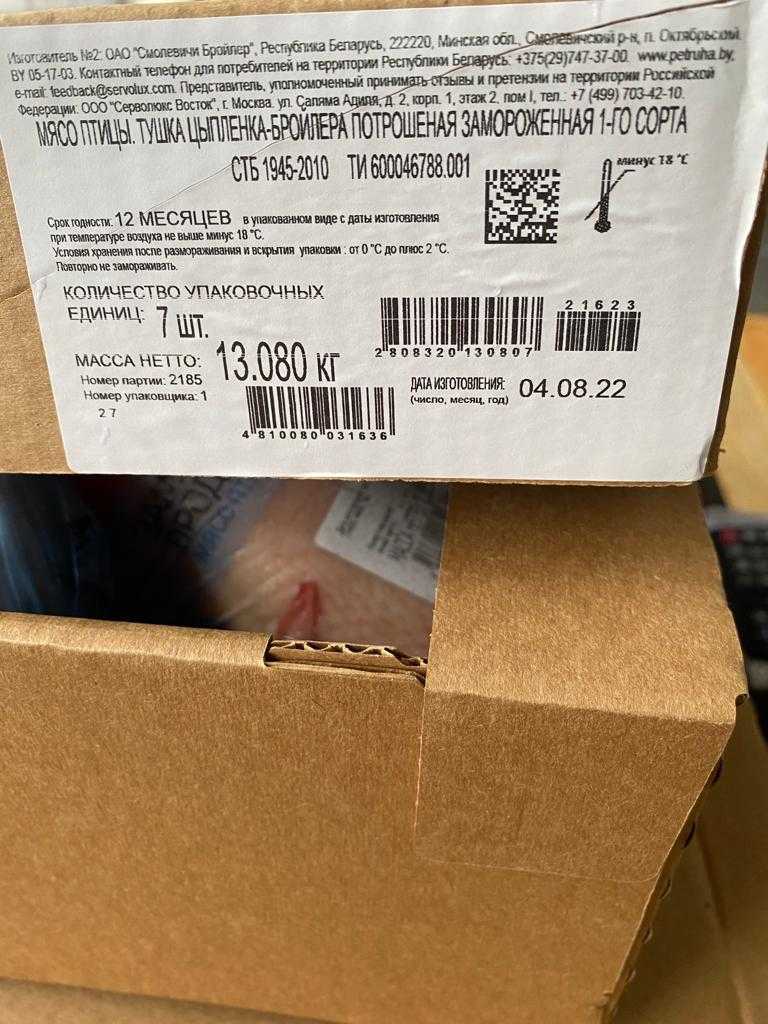 Nutritional value (average value) per 100g of the product: protein-17.0g, fat-13.0g. Energy value (calorie content) in 100 g of the product is 190 kcal (770 kJ). Shelf life and storage conditions: 180 days at a temperature not higher than minus 18°C and relative humidity of 85-95%.