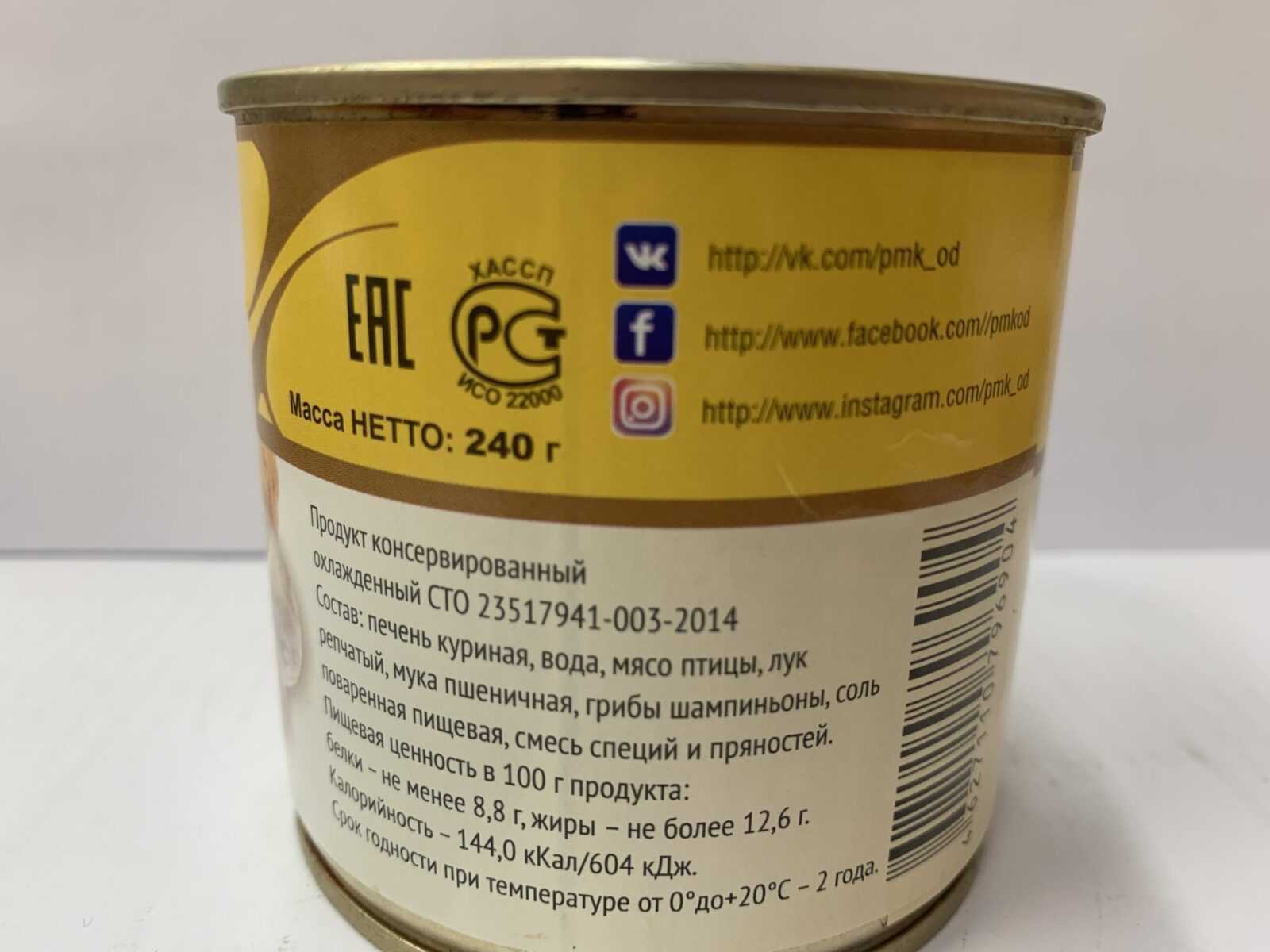 Nutritional and energy value per 100 g. (average values): Proteins-8,8 g. Fats-12,6 g.kcal 144/ kJ 604. Expiration date and storage conditions: 2 years at temperatures from 0 to 20°C.