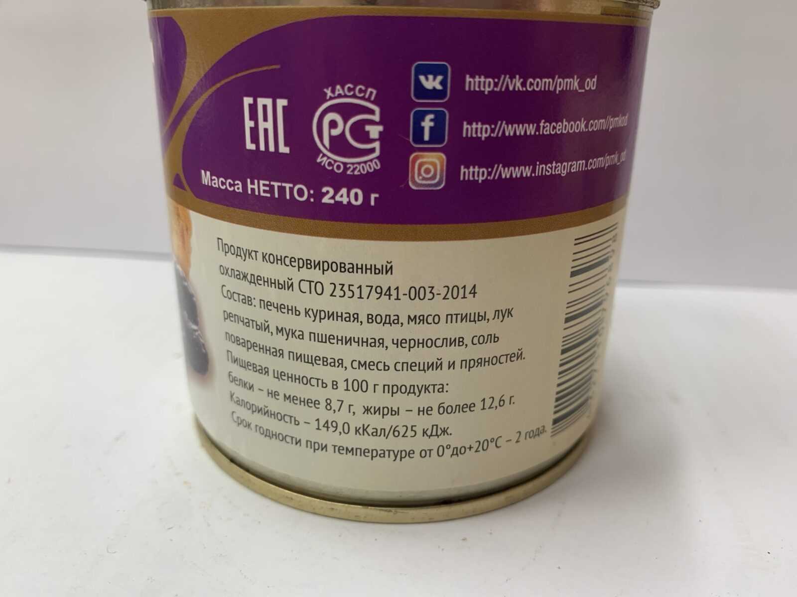 Nutritional and energy value per 100 g. (average values): Proteins-8,7 g. Fats-12,6 g.kcal 149/ kJ 625. Expiration date and storage conditions: 2 years at temperatures from 0 to 20°C.
