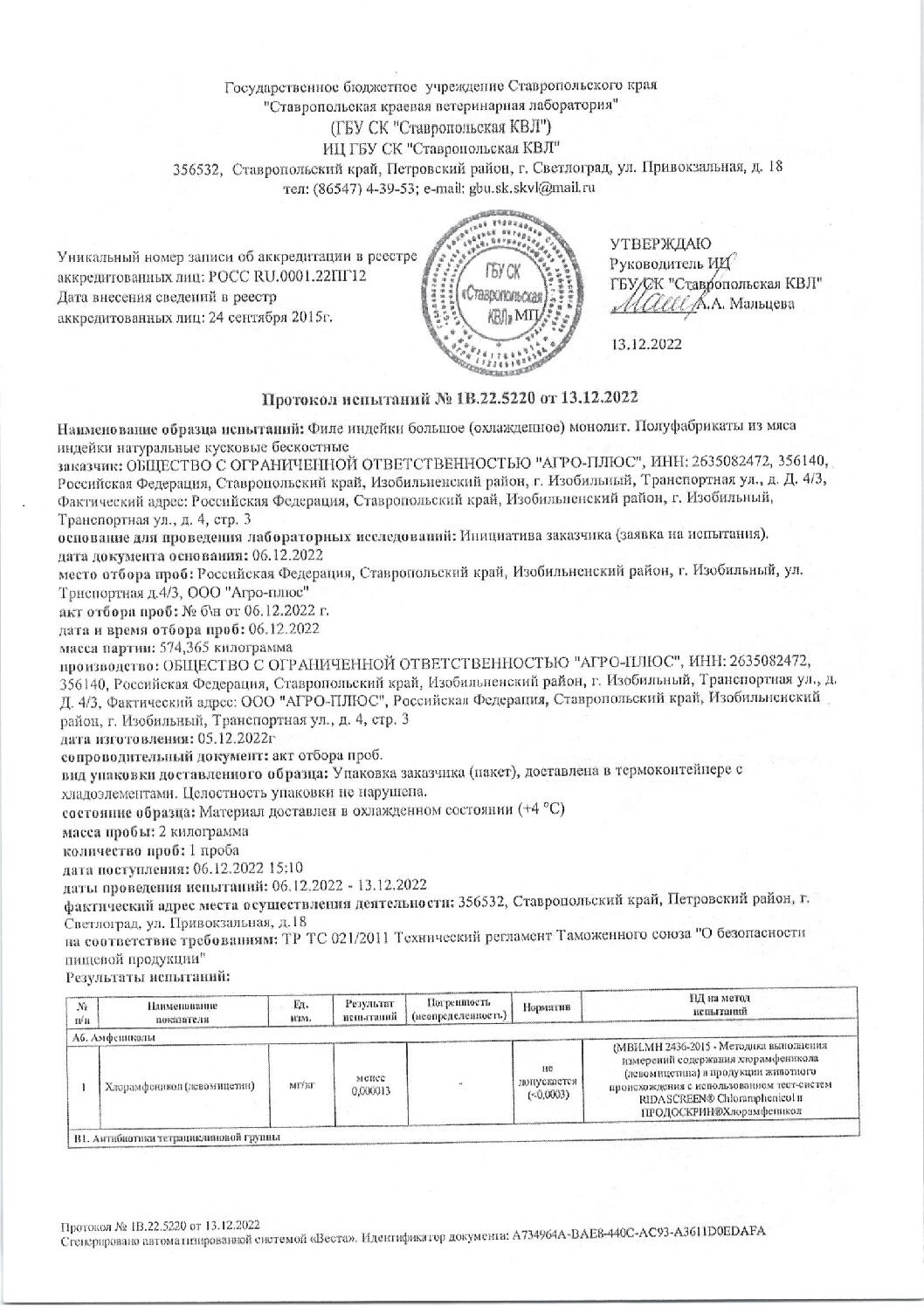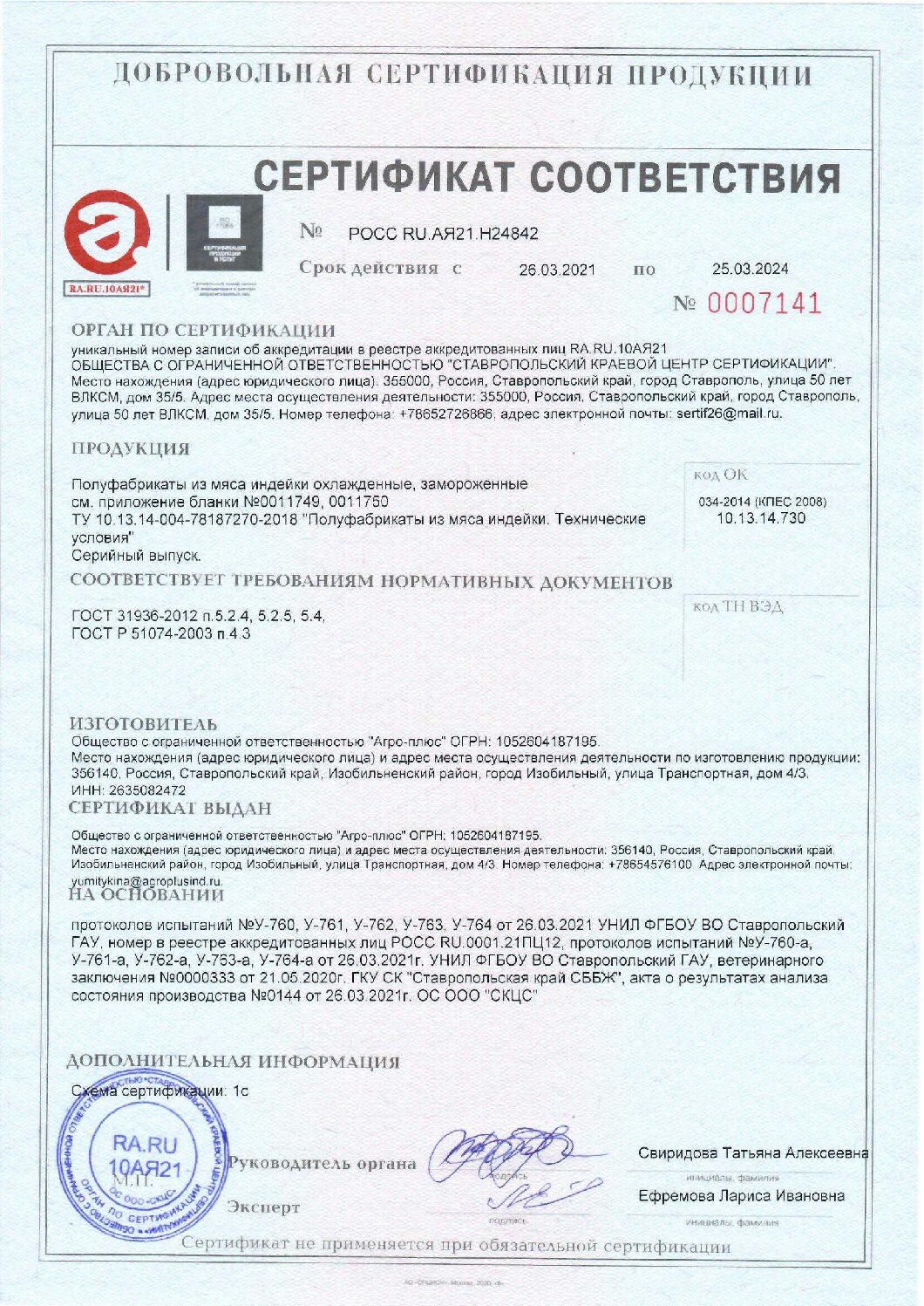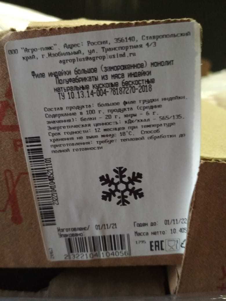 Nutritional and energy value per 100 g. (average values): Proteins-20 g. Fats-6 g.kcal 135/ kJ 565. Expiration date and storage conditions: 12 months at temperatures below minus 18°C.
