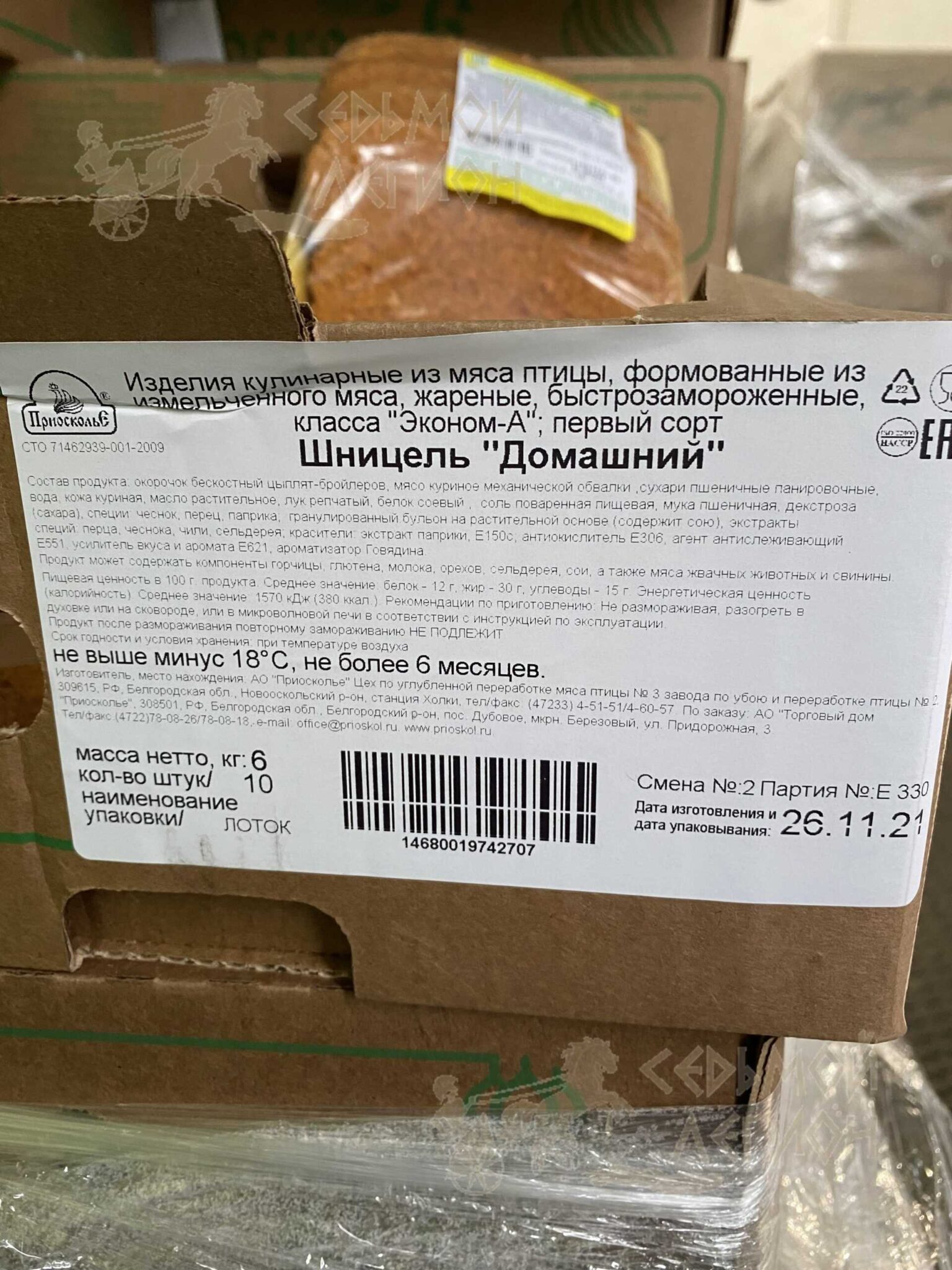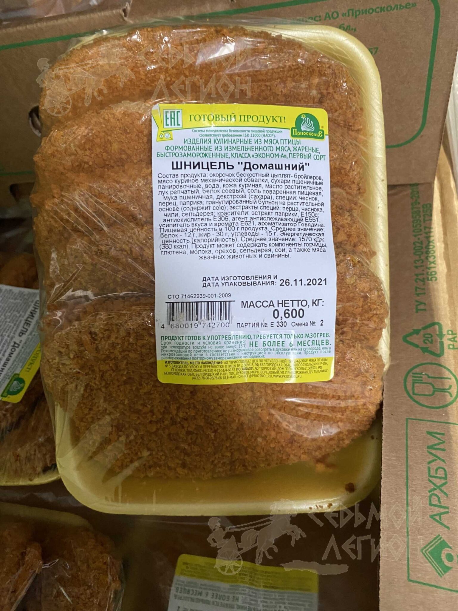 Nutritional value per 100 g. Average values: proteins-12 g., Fats-30 g., Carbohydrates-13 g. Energy value (calorie value). average value: 1540 kJ (370kcal). Expiration date and storage conditions: 6 months at temperatures below minus 18°C.