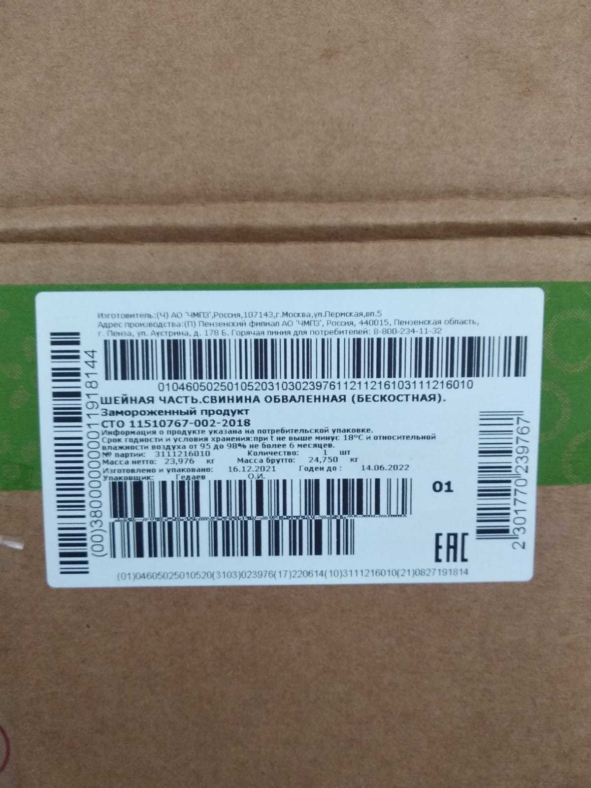 Expiration date and storage conditions: 6 months at temperatures below minus 18°C and relative humidity 95-98%.