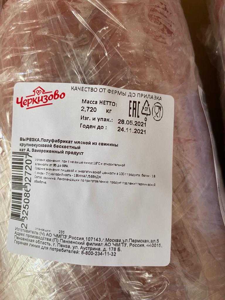 Nutritional and energy value per 100 g. (average values): Proteins-18 g. Fats-7 g.kcal 135/ kJ 566. Expiration date and storage conditions: 6 months at temperatures below minus 18°C and relative humidity 95-98%.