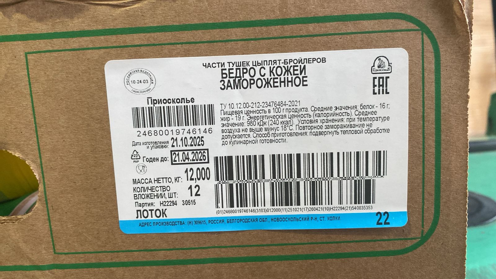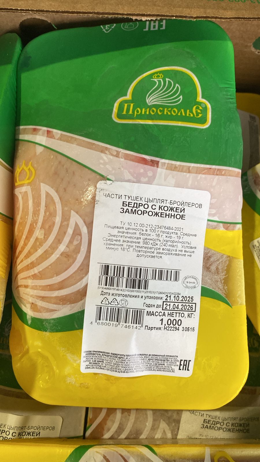 Пищевая ценность в 100 г продукта. Среднее значения: белок-17 г;жир-16 г. Энергетическая ценность (калорийность).Среднее значение: 880 кДж (210 ккал). Cрок годности и условия хранения: 6 месяцев при температуре не выше минус 18°C и относительной влажности воздуха 80-90%.