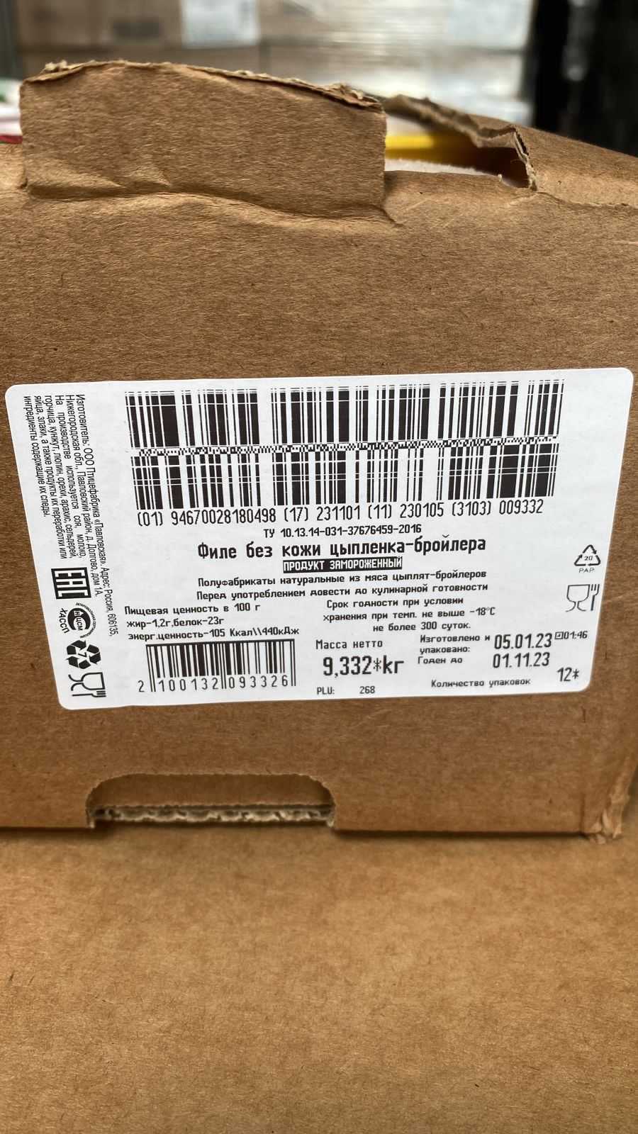 Пищевая и энергетическая ценность на 100г. продукта (среднее значение): Белки-21г. Жир-2,5г. кКал 140/кДж 450. Cрок годности и условия хранения: 6 месяцев при температуре не выше минус 18°C.