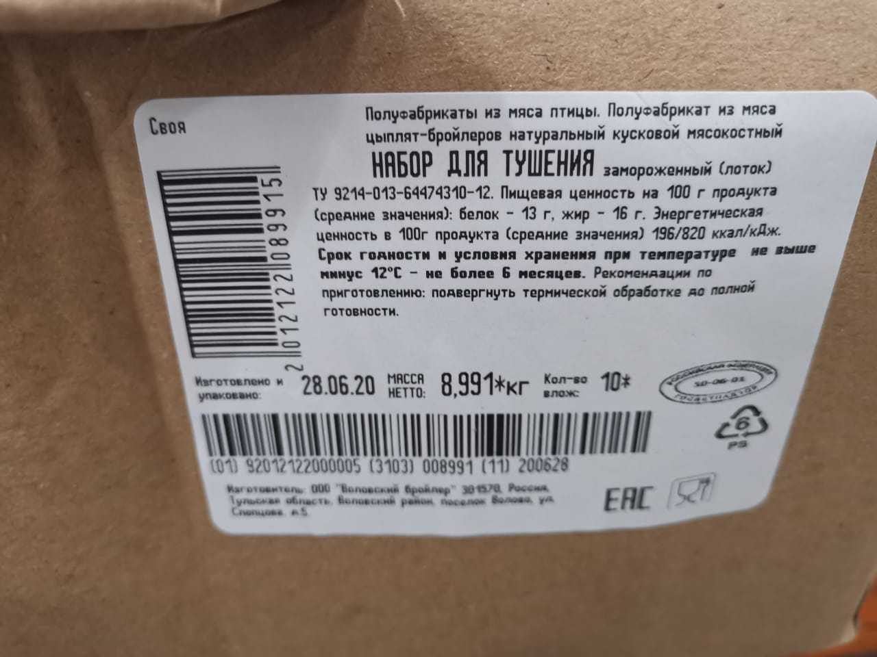 Пищевая ценность на 100г. продукта (средние значения): Белок-13г. Жир-16г. Энергетическая ценность в 100г. продукта (средние значения) 196/820ккал/кДж. Cрок годности и условия хранения: 6 месяцев при температуре не выше минус 12°C.