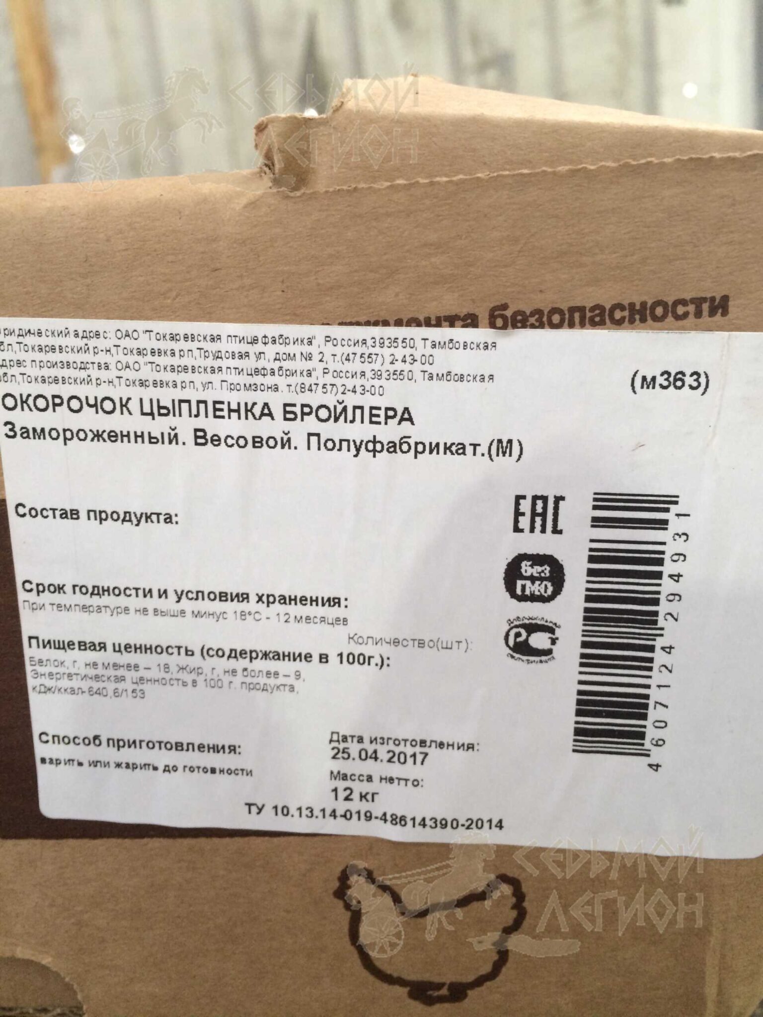 Пищевая ценность (содержание в 100г.): Белок не менее-18г. Жир не более-9г. Энергетическая ценность в 100г. продукта: кДж/ккал-640,6/153. Cрок годности и условия хранения: 12 месяцев при температуре не выше минус 18°C.